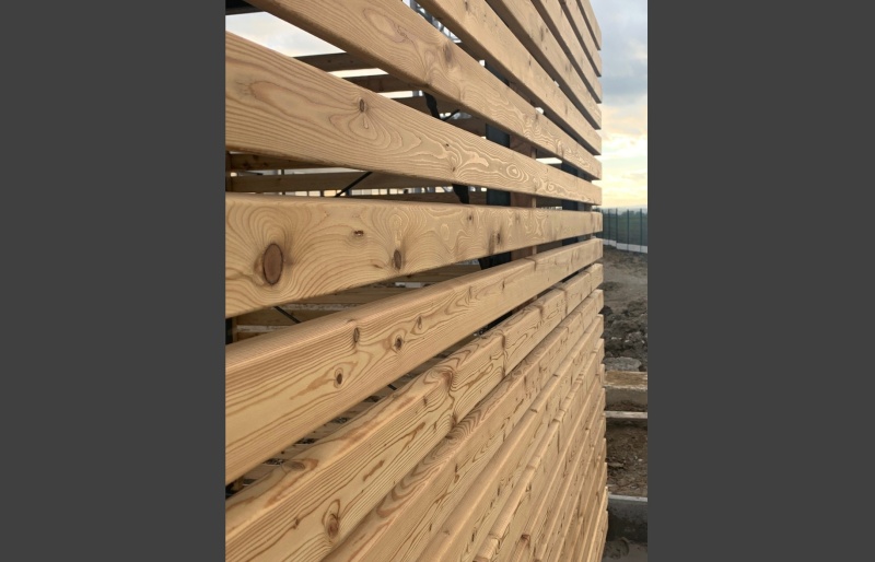 z lepených lamelového dřeva v přímém provedení a je doplněn o řezané krokve a zavětrování s pomocí dřevěných hranolů.