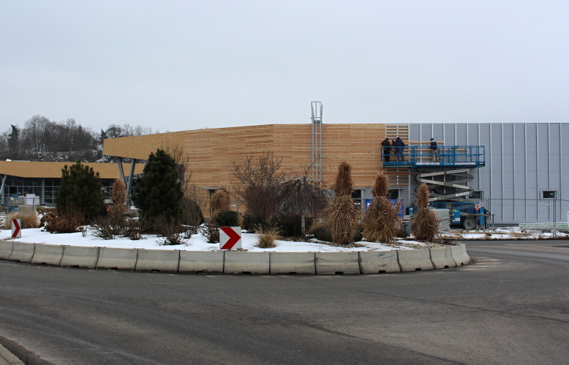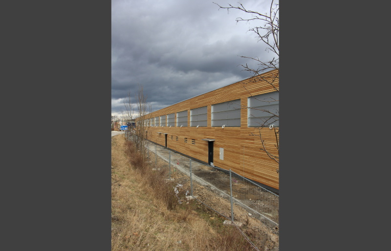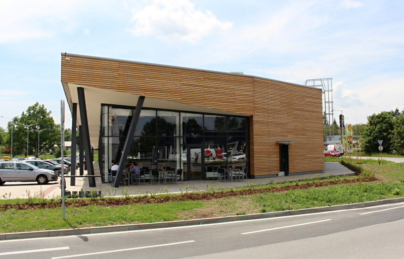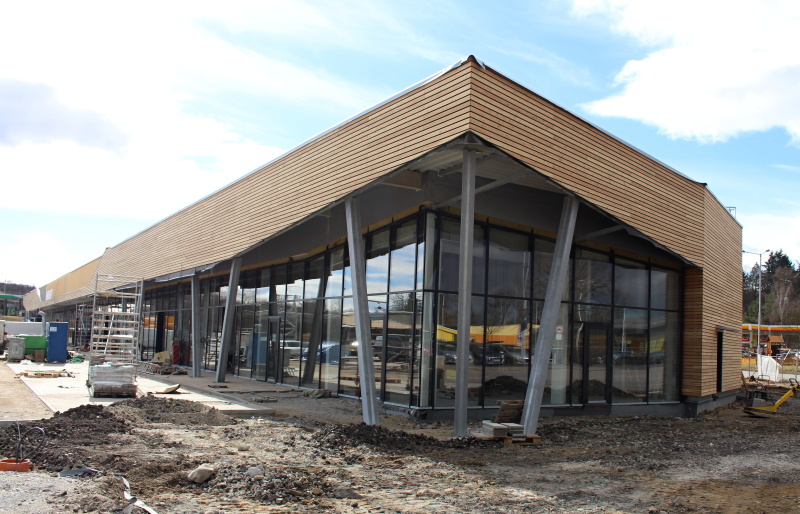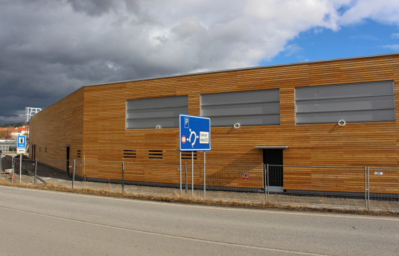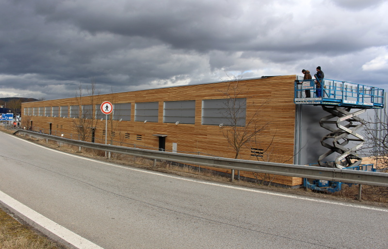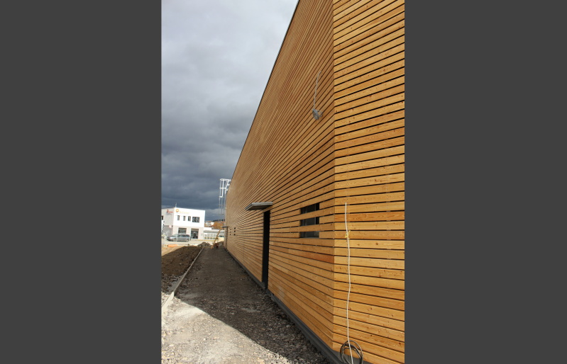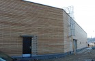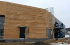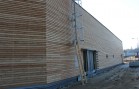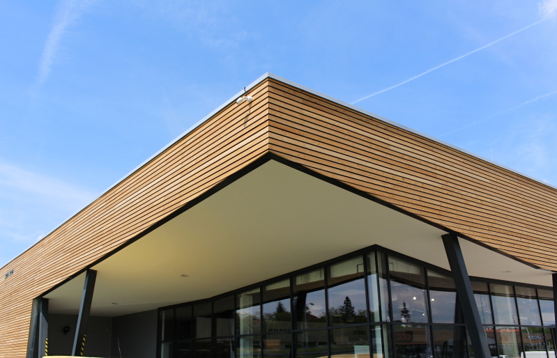 Na realizovaném obchodním centru v Písku jsme se dohodli s generálním dodavatelem na dodávce a montáži dřevěného obkladu fasád včetně podkladních ocelových profilů. Obklad byl realizován ze sibiřského modřínového profilu Rhombus. Dodávka profilu byla atypická a to s tloušťkou 25 mm a výškou pohledové části 80 mm.