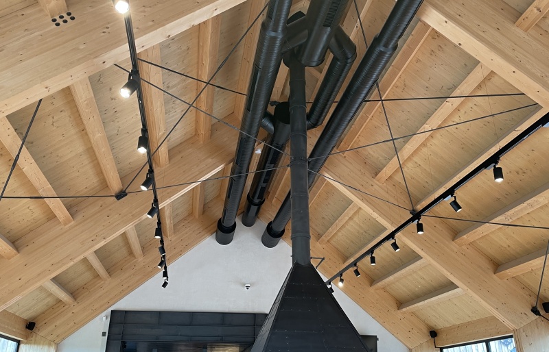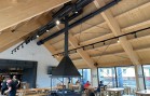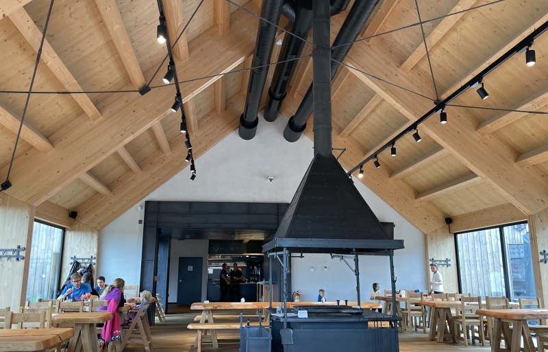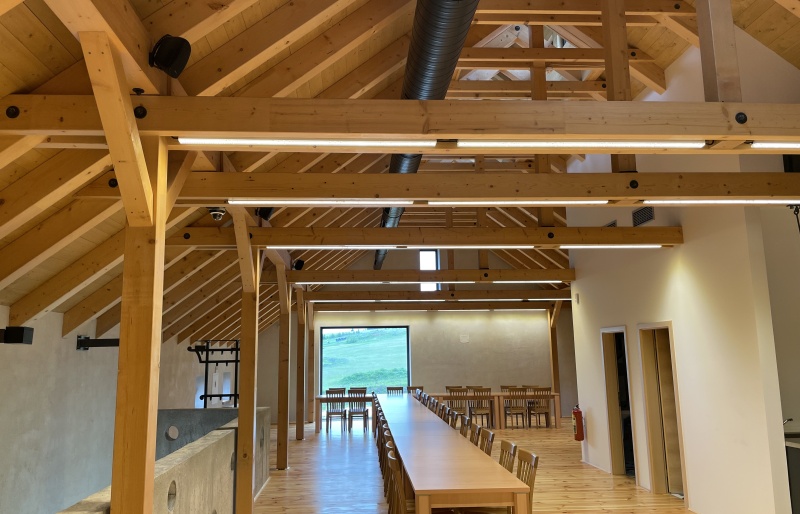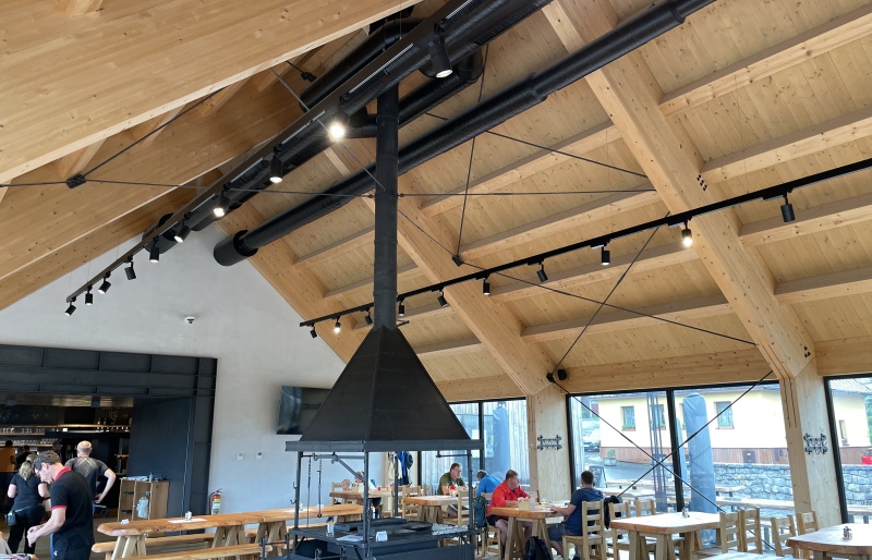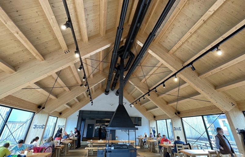 Druhým objektem je restaurace. Zde je jako nosná konstrukce použito lepené lamelové dřevo. Na vlastní 4 ks rámů je použito lepené dřevo vyšší jakosti a to GL 28c. Zbytek konstrukce je z klasické jakosti GL 24h. Opět jako záklop jsou použity podlahové palubky tl. 24 mm.