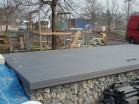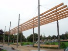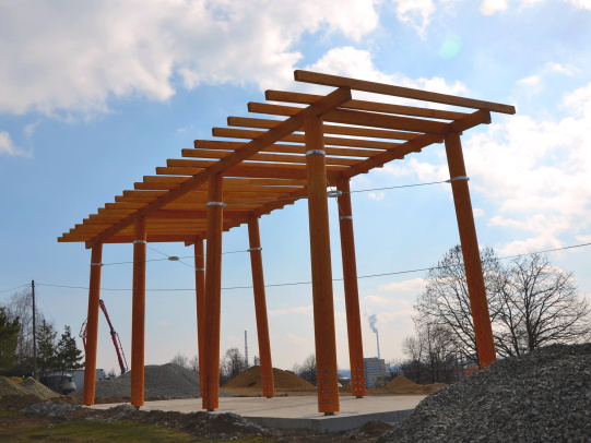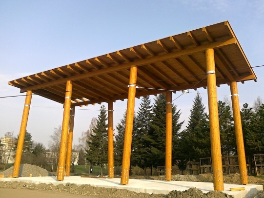 Dalším objektem realizovaným naší společností je trojice pergol, kde na betonové sloupy jsou přes ocelové rektifikovatelné závěsy kotveny průvlaky z lepeného lamelového dřeva, které je v tomto případě v rovném provedení.