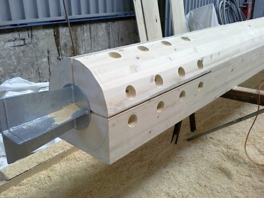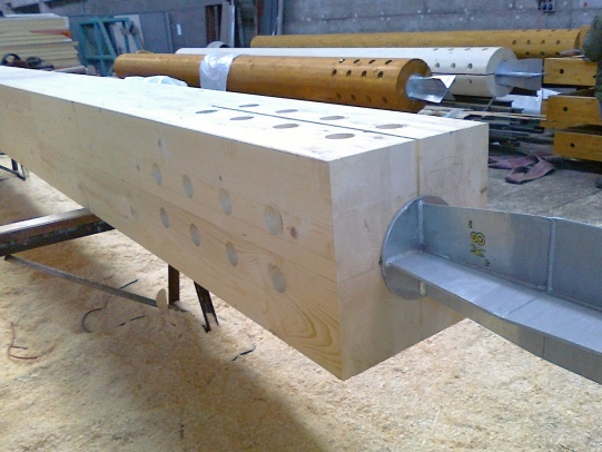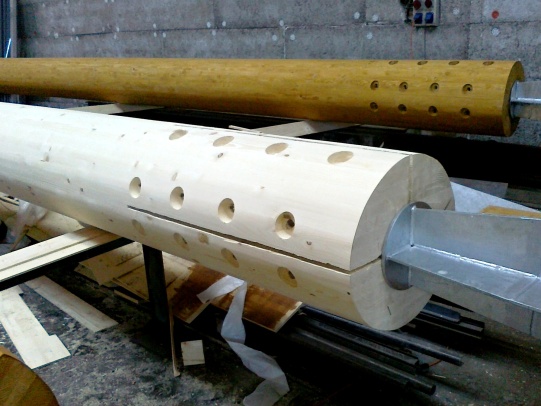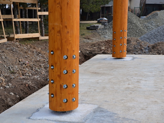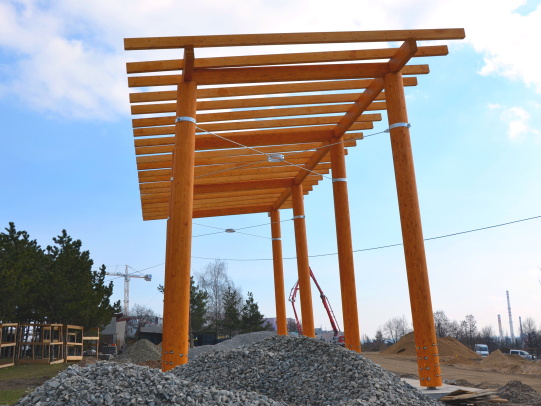 Jedním z realizovaných dřevěných objektů je tzv. Sella Terrena - pergola, kde zajímavostí a možná by se mohlo říct i atypickou konstrukcí je dodávka lepených dřevěných sloupů, kde původně čtvercový profil je opracován na sloup kruhového průřezu s průměrem 500 mm. Kromě vlastní stavby objektu, je přiloženo i několik fotek z realizace právě těchto sloupů s kruhovým průřezem.