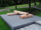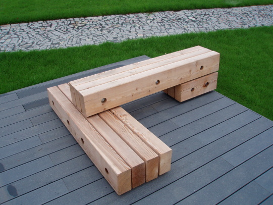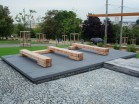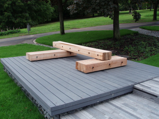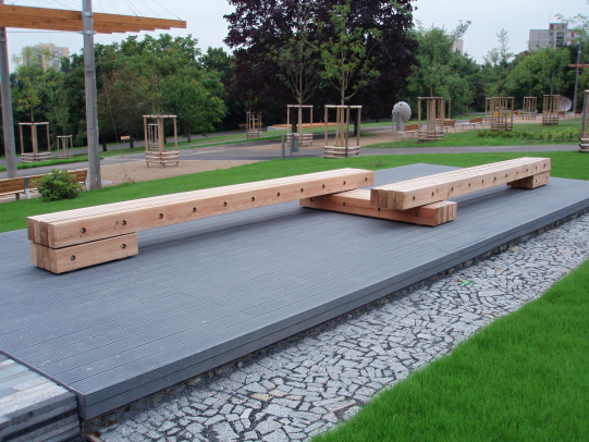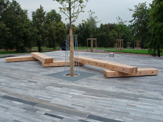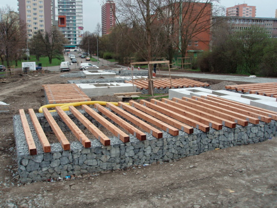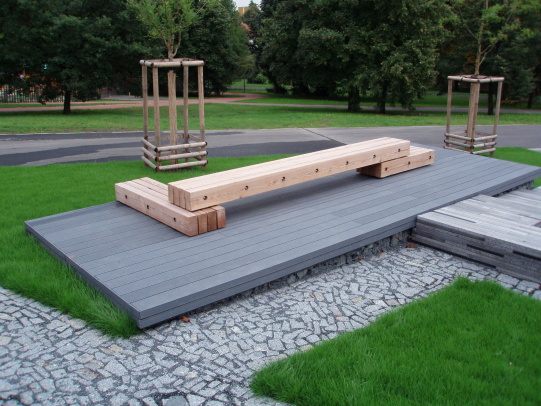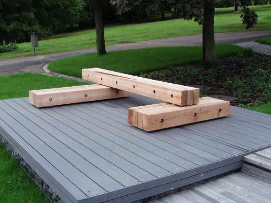 Na kaskádových terasách jsou pevně uloženy dřevěné lavičky, které jsou navrženy a zrealizovány tak, že mají podobný vzhled, ale jsou různě dlouhé a různě poskládané. Lavičky jsou vyrobeny a složeny z řezaných hoblovaných hranolů, dřevinou je modřínový masiv.