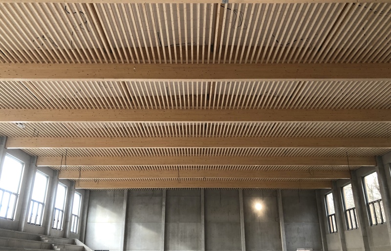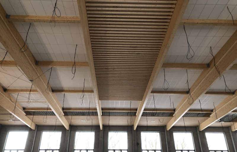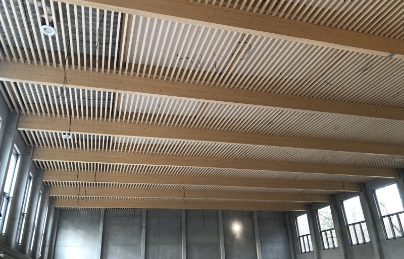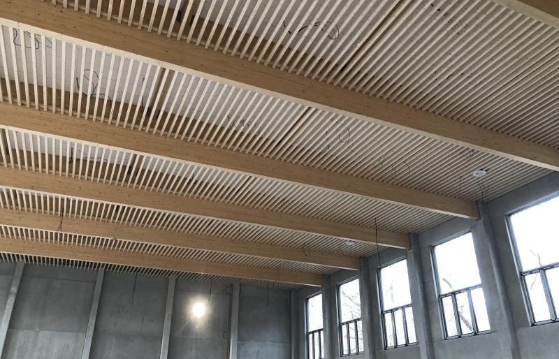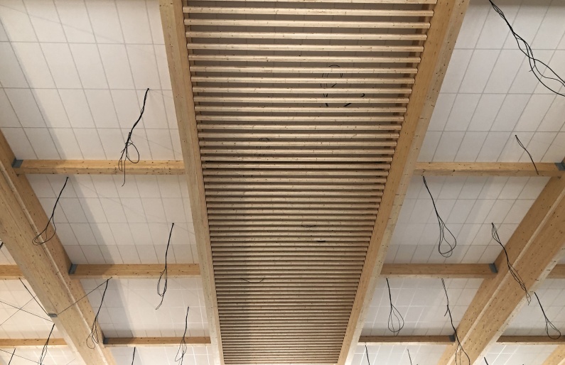 podhled z lepeného lamelového dřeva ošetřeného bezbarvým lazurovacím nátěrem. Tyto lepené hranoly jsou kotveny do pomocných KVH hranolů a to v osových vzdálenostech cca 250 mm.