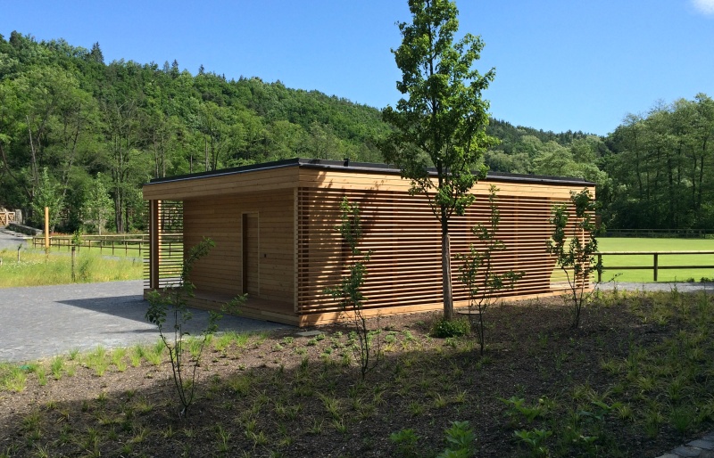 V areálu u Kadna jsme realizovali dřevěný objekt, který slouží jako technické zázemí. Nosný skelet objektu o půdorysných rozměrech cca 8 x 10 m je vytvořen z KVH hranolů pospojovaných BOVA kováním. Tento je následně jednostranně opláštěn OSB deskami a to jak na stěnách tak i na střeše.