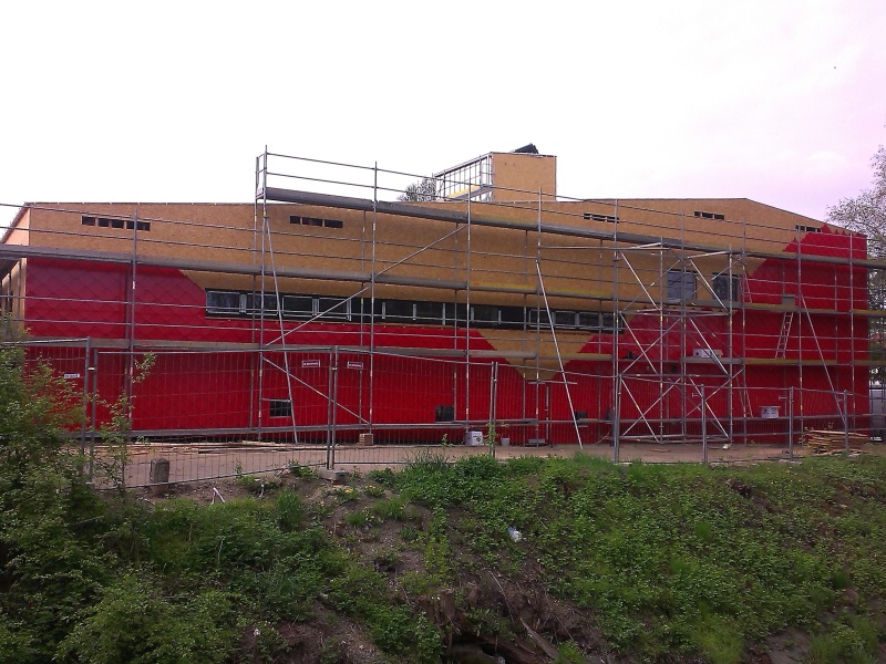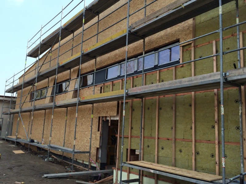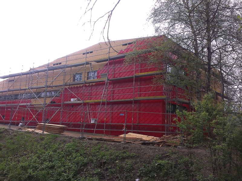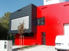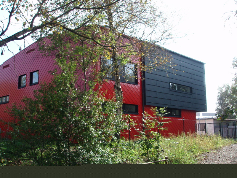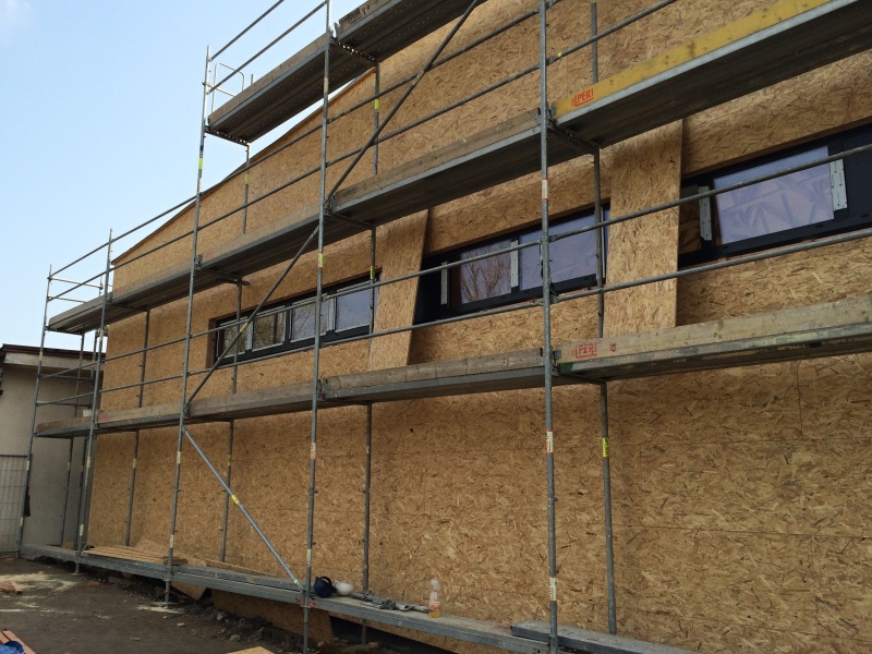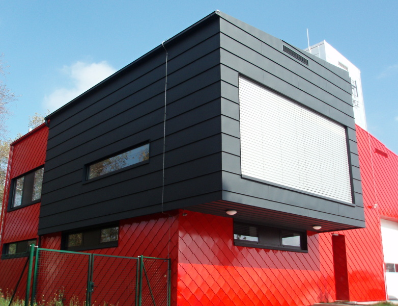 provětrávaný zateplovací fasádní systém s plechovým obkladem. Naše společnost realizovala část vnějšího obkladu právě montáži pomocné dřevěné nosné konstrukce, 2 x 60 mm překládané tepelné izolace a záklopu z OSB desek. Na takto vytvořený fasádní podkladní systém jsou následnbě kotveny vlastní vnější fasádní šablony z legovaného hliníku v červěné barvě nebo z titanzinkového předzvětralého plechu. Pokládka šablon ovšem nebyla předmětem naší realizace.