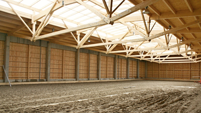 Nosnou konstrukci střechy jízdárny tvoří osm příhradových střešních konstrukcí z lepeného lamelového dřeva. Ve štítech je konstrukce doplněna přímými vazníky podepřenými dřevěnými lepenými sloupy.