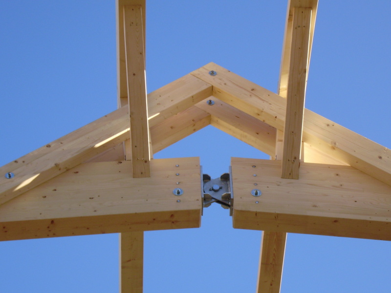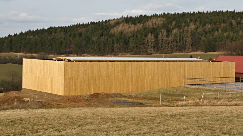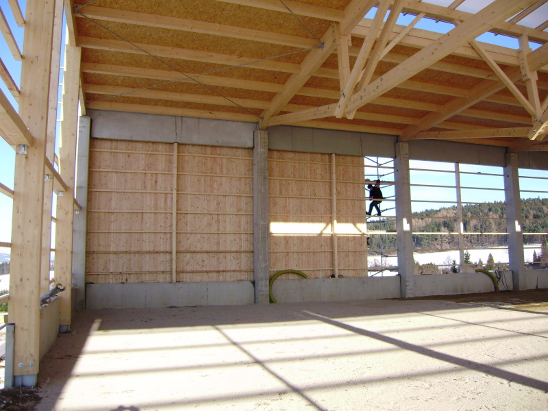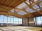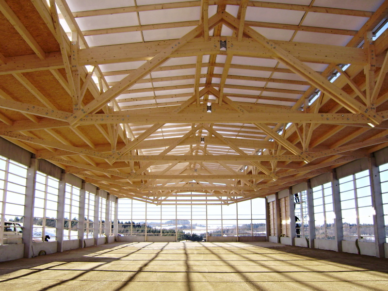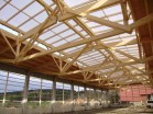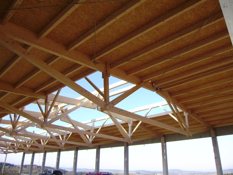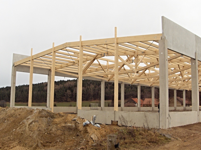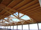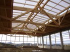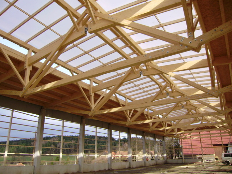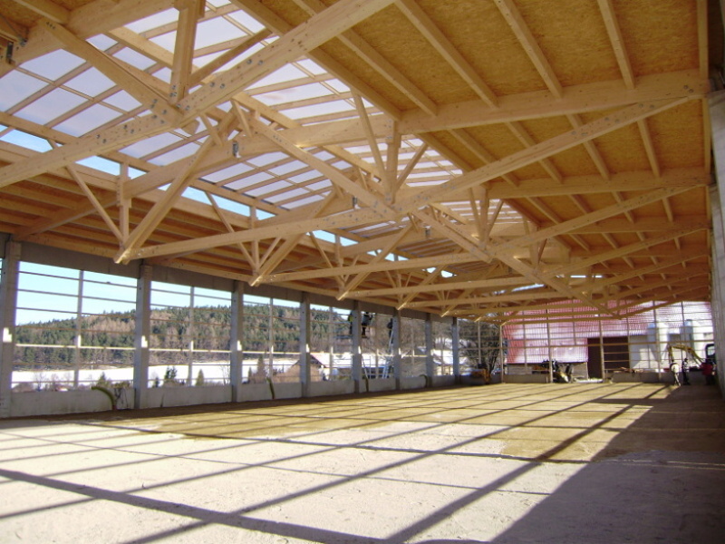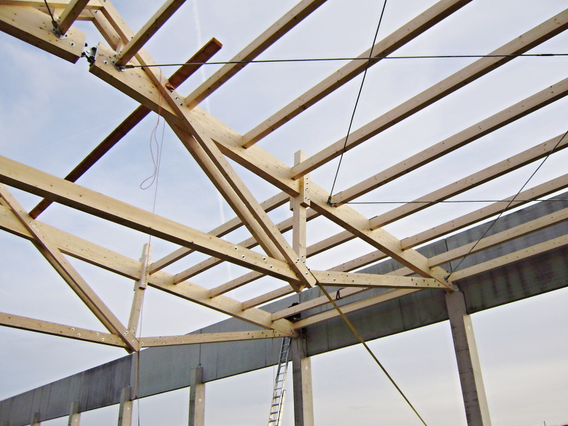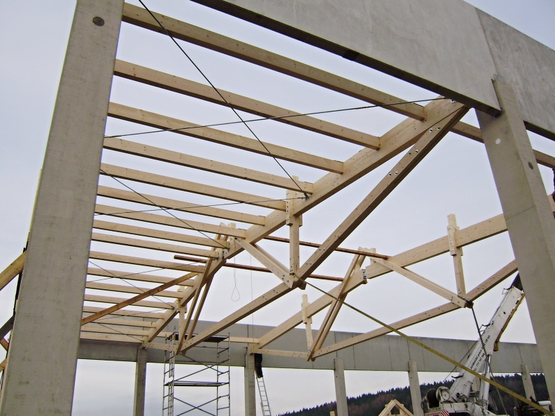 Dřevěné části příhradové konstrukce byly opracovány na CNC dřevoobráběcím centru a sestaveny s pomocí styčníkových plechů, kolíků a svorníků. Nosný systém střechy je doplněn o řezané hoblované krokve a dále o dřevěnou světlíkovou konstrukci.