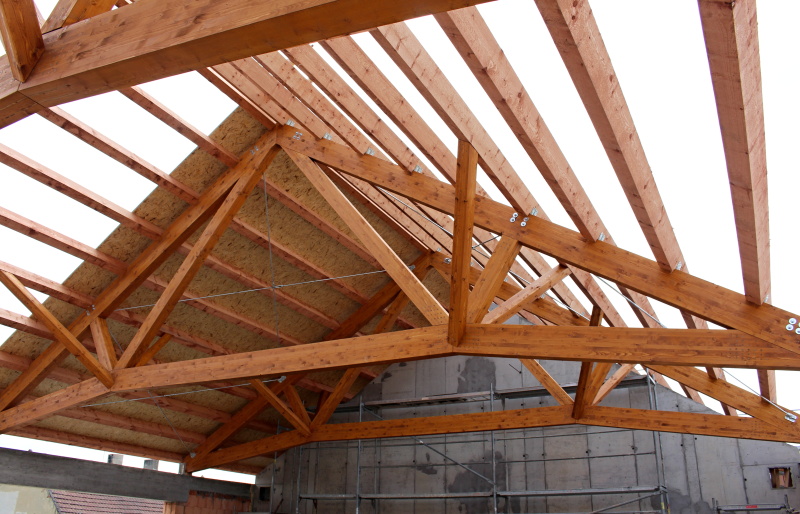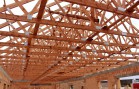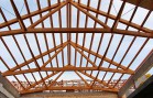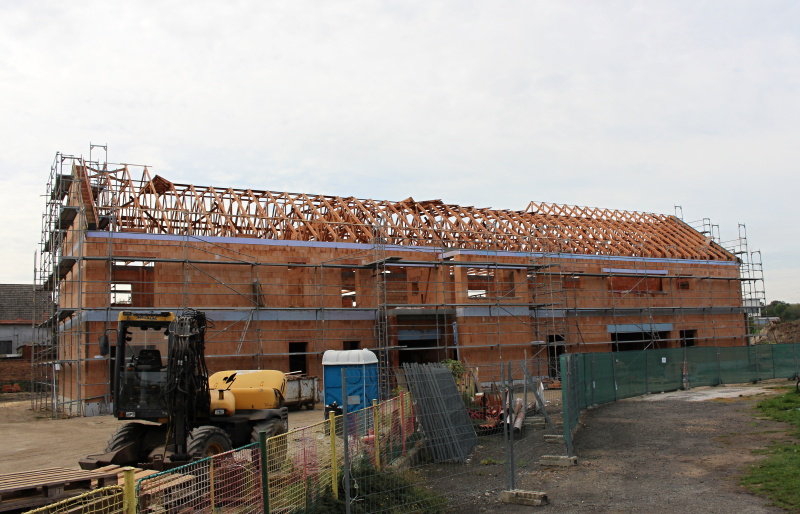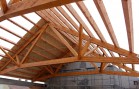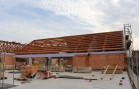 - Druhá část nad budoucím sálem, která bude pohledová, jsou použity příhradové nosníky z lepeného lamelového dřeva se styčníkovými ocelovými deskami a se spojem dřevo ocel pomocí samovrtných ocelových kolíků. Konstrukce je dálůe doplněna dřevěnými řezanými krokvemi po vlašsku. Zajímavostí této příhradové konstrukce z lepeného dřeva je požadavek na požární odolnost nosníků. Ta musí být 30 minut. Z tohoto důvodu jsou věškeré ocelové prvky příhradové konstrukce ( styčníkové desky a samovrtné kolíky ) zadlabány a zazátkovány.