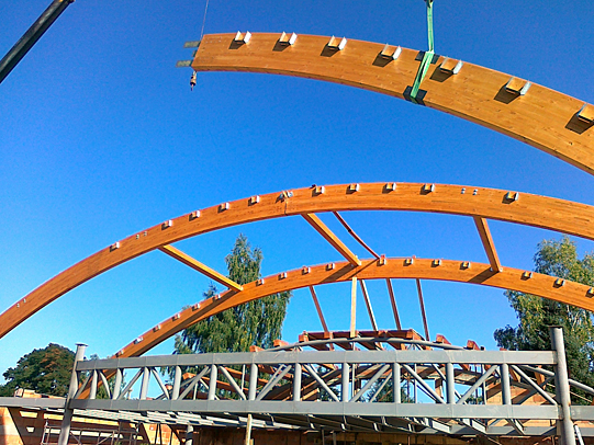 Hlavní nosná konstrukce je tvořena lepenými obloukovými dřevěnými vazníky třídy GL 24h. Ty působí jako dvoukloubové s montážním spojem ve vrcholu. Celkem se jedná o dva oblouky s profilem na rozpětí 25,8 m, dva oblouky s profilem na rozpětí 18,5 m a jeden oblouk bez montážního spoje s profilem na rozpětí 13 m. Lepené dřevo obloukového provedení je kotveno do železobetonových pilířů pomocí ocelových přípravků na předem zabetonované šrouby. Střešní plášť je vynášen vlašskými krokvemi, které jsou ve většině případů zapuštěny celou svou výškou mezi oblouky. U nejmenšího oblouku jsou kladeny shora na horní hranu. Kotvení oblouků na pilířích, vrcholový spoj a další přípoje jsou provedeny pomocí ocelových přípravků a spojovacích prostředků kolíkového typu. Přípoje krokví a výměn je provedeno pomocí ocelových spojovacích prostředků z tenkého pozinkovaného plechu, hřebíků, vrutů a v případě kotvení k betonu také pomocí chemických kotev.