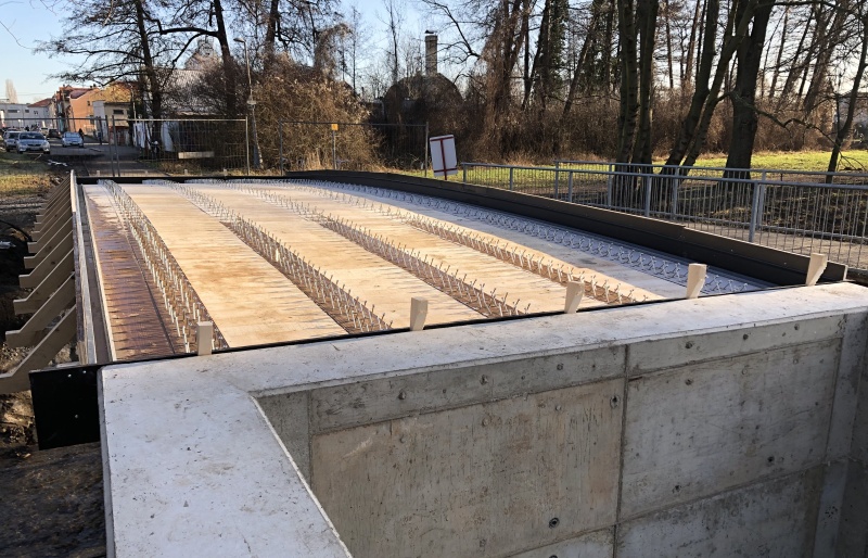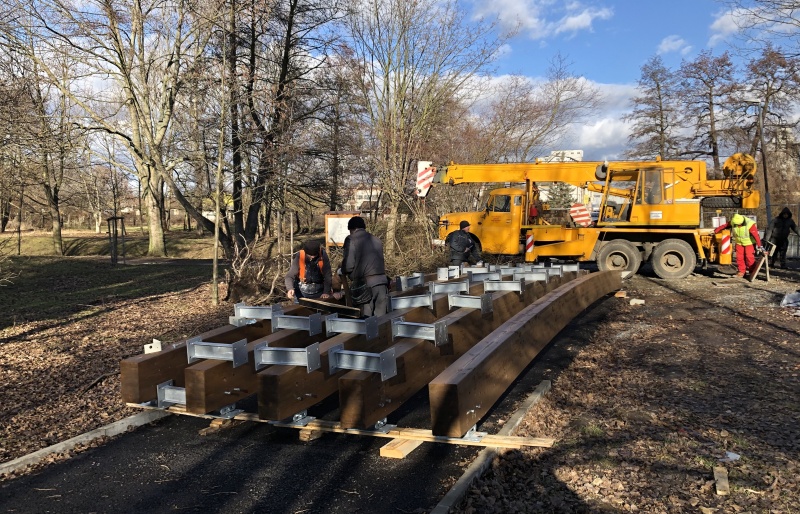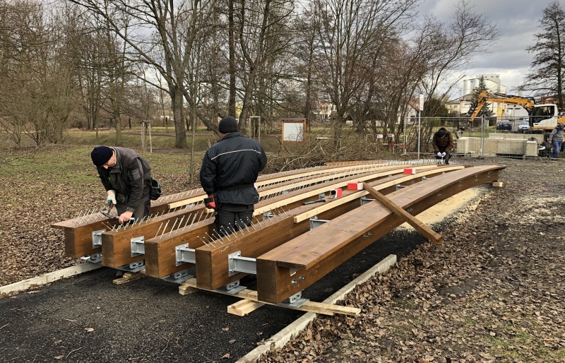 Nosná konstrukce lávky je vytvořena z 5 ks nosníků z lepeného lamelového dřeva v obloukovém provedení. Ty jsou navzájem pospojovány ocelovými příčníky a rovněž tak ocelovými kotevními prvky. Na vrchní ploše nosníku jsou kotveny ocelové vruty, které vytvoří spřažení dřeva s betonovou deskou budoucí mostovky. Množství a rozměry vrutů jsou dány statickým výpočtem naší společnosti.