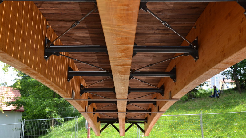 Hlavní nosná konstrukce lávky je navržena jako tří trámová konstrukce z plnostěnného lepeného lamelového dřeva v obloukovém provedení třídy GL24h a GL28h. Staticky působí jako prostý nosník o jednom poli. Celková délka nosné konstrukce je 16,10 m se šířkou 2,20 m. Trojice lepených nosníků je vzájemně spojena příčníky z ocelových uzavřených profilů. Ztužení konstrukce lávky v příčném směru je provedeno z ocelových příčníků se systémem ocelových táhel z oceli. Ocelová ložiska nosné konstrukce jsou navržena na jedné opěře jako všesměrně pevné ložisko pod středovým trámem a podélně pevné ložisko pod krajními trámy. Na druhé opěře je středový trám uložen pomocí ložiska příčně pevného a krajní trámy s uložením pomocí všesměrně pohyblivého ložiska.