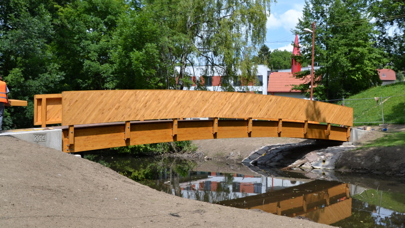 Celá konstrukce zábradlí je smrková, z části z lepeného lamelového dřeva a z části z masivu. Zábradlí je složeno ze svislých sloupků, šikmých výplní a vodorovného madla. Výplně jsou ukotveny na sloupky, madla a dolní pomocný profil. Madla jsou z profilu 120/100 mm a to ze dřeva tř. GL24h. Sloupky jsou z profilu 120/120 mm a opět ze dřeva tř. GL24h a jsou přikotveny k hlavním nosníkům. Jednotlivé prvky výplní jsou profilu 30/50 mm ze dřeva tř. C22 a jsou připevněny vruty. Připevnění šikmých výplní na sloupky a madla je provedeno z vnější strany mostu. Madlo a konce výplní budou z vrchu překryty pomocným krycím prknem 150/30 ze dřeva tř. C22.