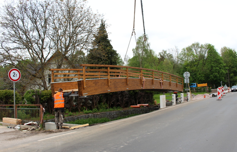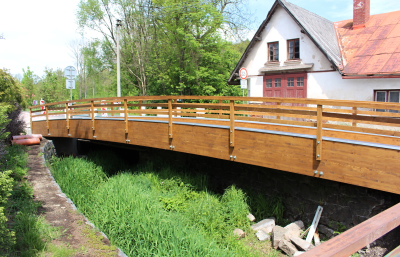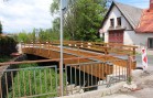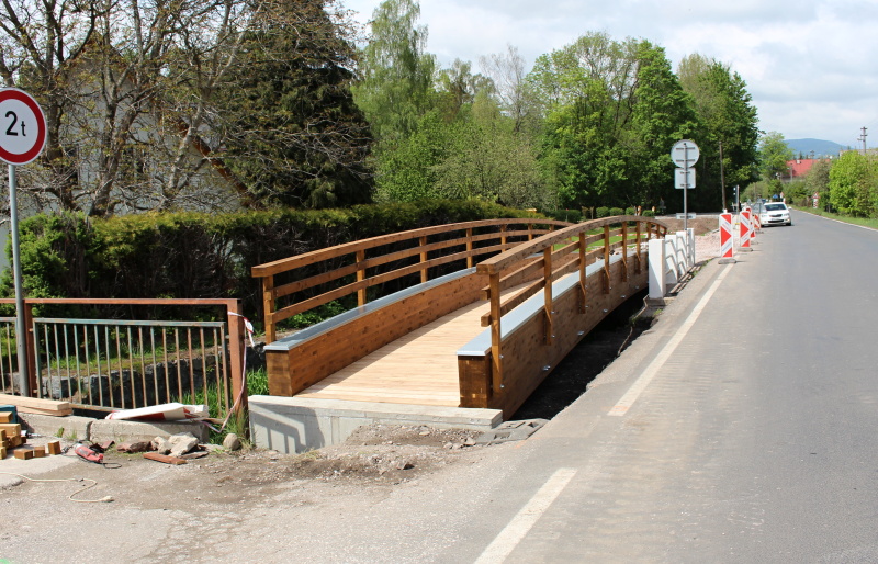 Podél hlavní silnice v obci Kunčice nad Labem a vedle stávajícího mostku přes Vápenický potok je v rámci realizace nových chodníků navržena a naší společností zrealizována dřevěná lávka pro pěší. Lávka je oblouková na rozpětí 15,9 m s čistou průchozí šířkou 1,5 m, nadvýšení v polovině rozpětí lávky není velké, je cca 0,7 m. Nosnou konstrukci tvoří dvojice dvoukloubových oblouků z lepeného lamelového dřeva jakosti GL 28c. Příčníky jsou ocelové s řezanými dřevěnými podélníky, na kterých je položena vlastrní dubová mostovka. Zábradlí je opět dřevěné a to částečně z lepeného dřeva a částečně z KVH hranolů.