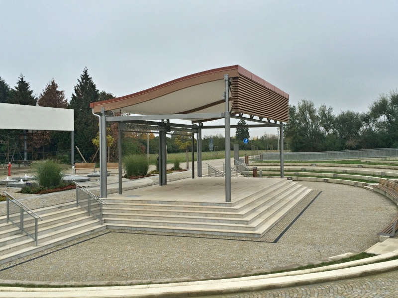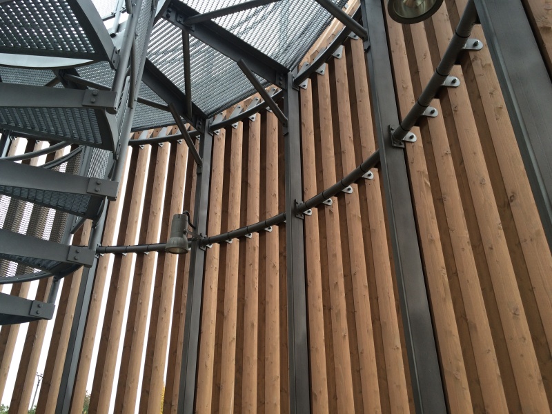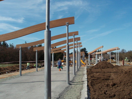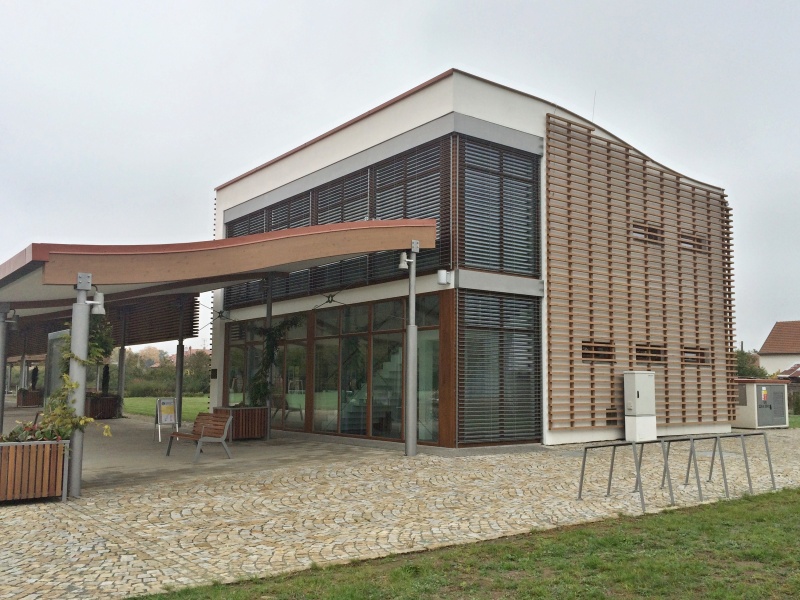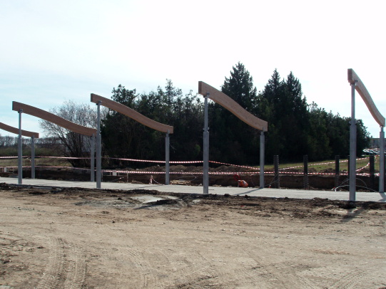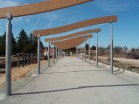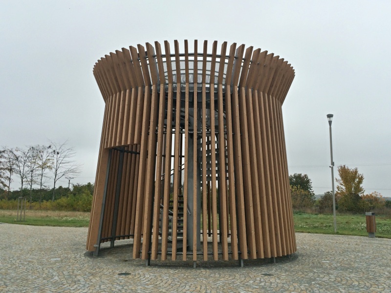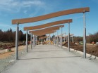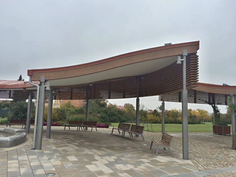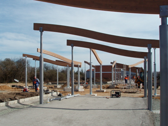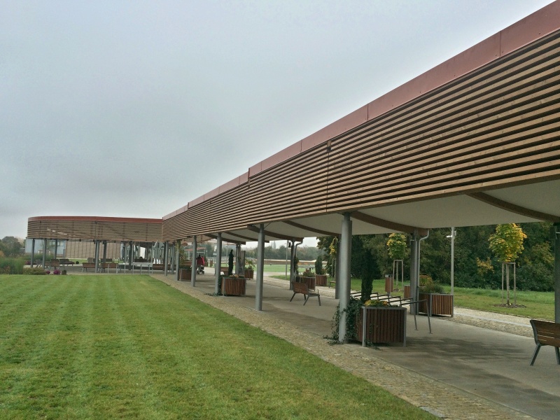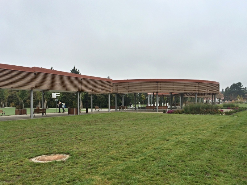 Záverem ještě několik technických informací. Kolonáda se skládá ze tří částí, dvě jsou liniové o délce 60 a 48 m a přibližně ve střední části je ve tvaru kruhové výseče. Budova zázemí je dvoupodlažní, s pultovou střechou. Čelní stěna má nosnou konstrukci z lepeného dřeva a je kompletně prosklená., Vlastní fasádu tvoří dřevěný obklad z horozontálních latí. Amfiteátr je dispozičně otevřený, je navržený a zrealizovaný ve stejném architektonickém stylu jako kolonáda. Informační bod, který současně slouží jako vyhlídka, má kruhový tvar ve tvaru snopu o poloměru 3,25 m a je vysoký 5,6 m. Fasáda objektu je z vertikálních dřevěných lepených latí o průřezu 80/200 mm.
