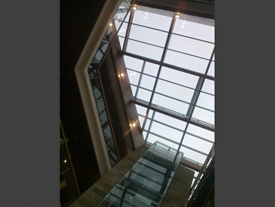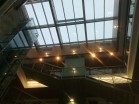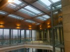 má půdorysný tvar lichoběžníku. Hlavní nosnou konstrukcí jsou čtyři obruby z lepeného lamelového dřeva v přímém provedení, které jsou vsazeny do otvoru nad atriem. Tři obruby jsou uloženy pomocí úhelníků a chemických kotev na železobetonovou stropní desku. Jedna obruba je uložena pomocí úhelníků a montážních svarů na ocelový nosník. Mezi obrubami je vytvořen pravoúhlý rastr z krokví a vazniček. Všechny dřevěné prvky mají slícovanou horní hranu. To má za následek, že některé prvky mají horní hranu seříznutou, čímž se vytváří tvar pultové střechy.