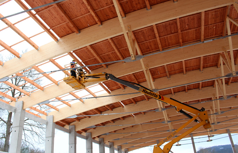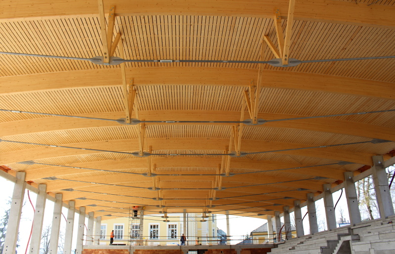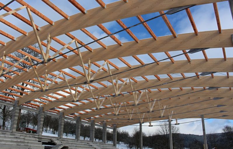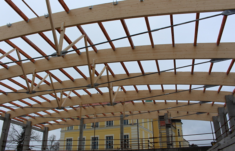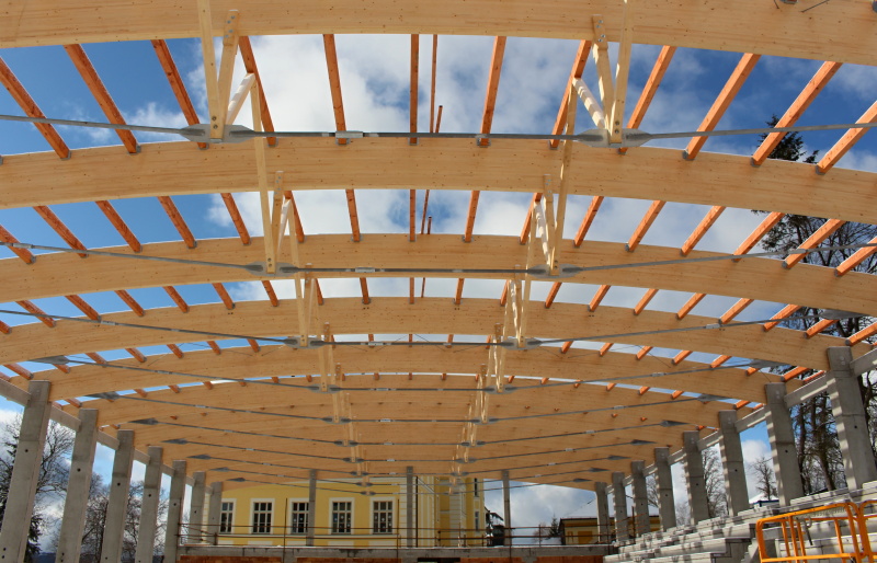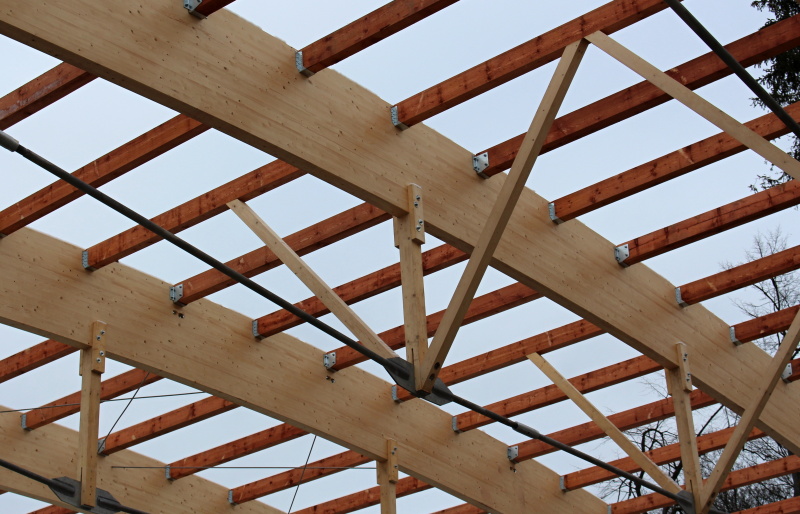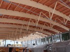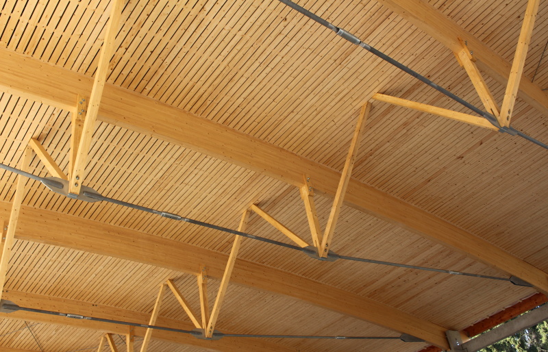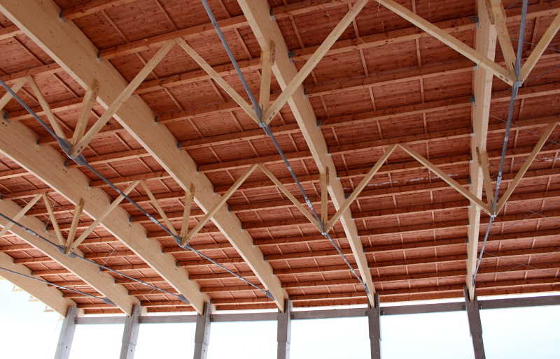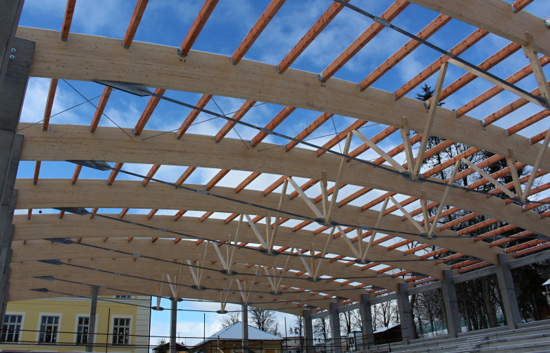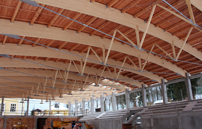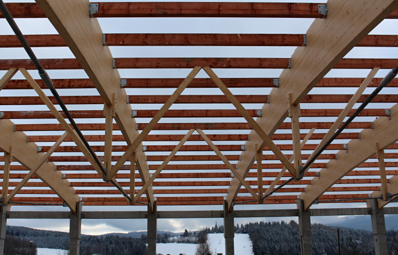 tvoří lepené obloukové vazníky s ocelovým táhlem a s dřevěnou vzpěrou. Osová vzdálenost takto vytvořených vzpínadlových vazníků je 4,2 m. Celá nosná konstrukce je doplněna o řezané krovy po vlašsku, které jsou zapuštěny mezi vazníky. Část těchto krovů vytváří současně ztužidla ve střešní rovině.
