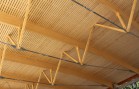 nadkrokevní izolaci. Nad vlastní tepelnou izolací je aplikovám celoplošný dřevěný záklop, pojistná hydroizolační folie, systém kontralatí a latí s definitivní střešní krytinou. V našem případě je použit trapézový plech kladený po spádu do oblouku. Na vnitřní části střešního pláště je parotěsná folie a trojtraně hoblovaná prkna kladená z důvodu akustiky s mezerou.