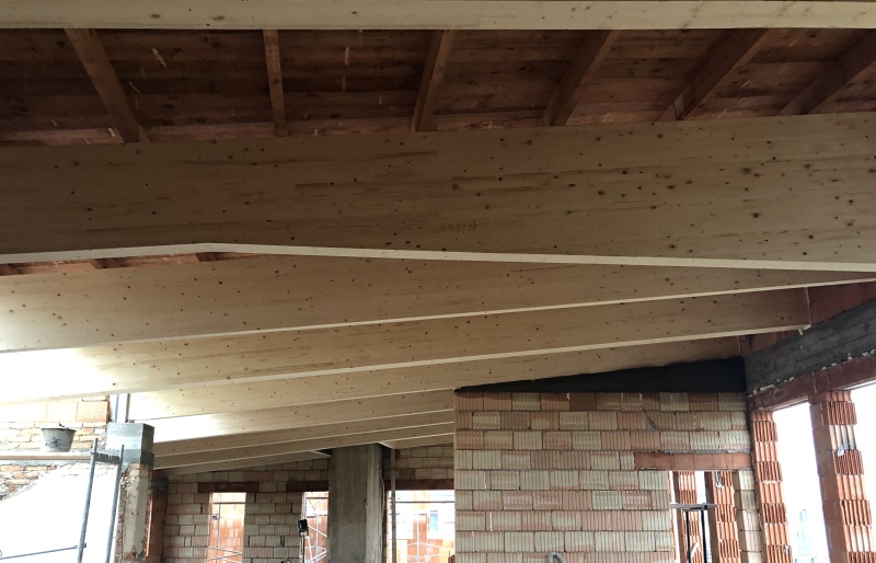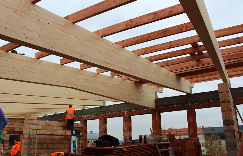 Pultová střecha těchto nových prostor a její nosná konstrukce je z lepeného lamelového dřeva v přímém provedení v rozetčích cca 2 m a je doplněna o řezané dřevěné nepohledové vaznice. Na nosné střešní konstrukci je aplikován dvojnásobný dřevěný prkenný záklop, čímž je vytvořen prostor pro odvětrání střešního pláště. Nezbytnou součástí dodávky je pochopitelně i pojistná paropropustná folie. Tepelné izolace a střešní krytina nebyly předmětem naší dodávky.