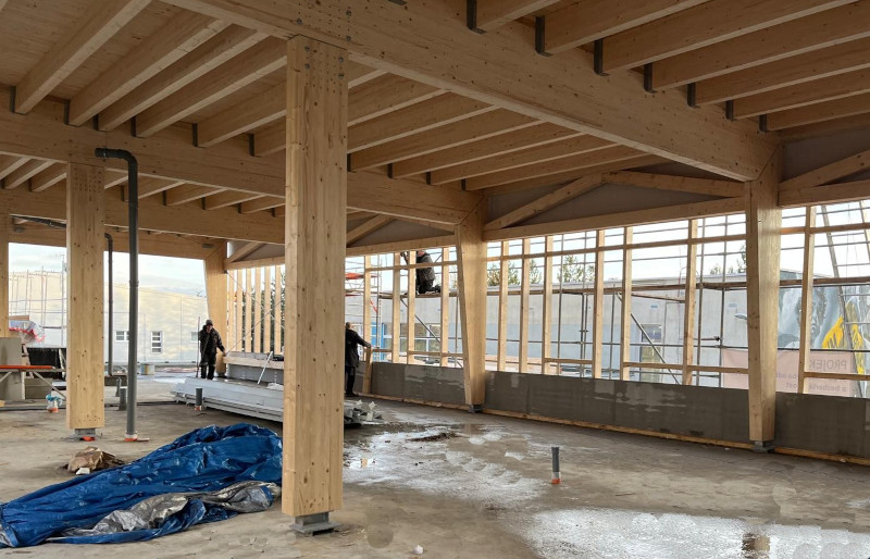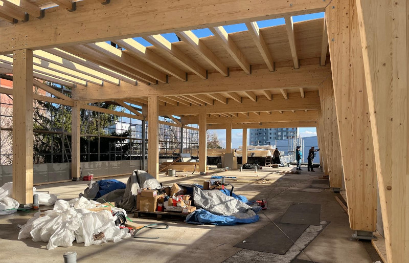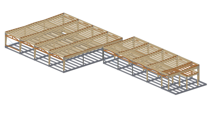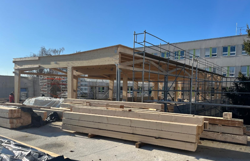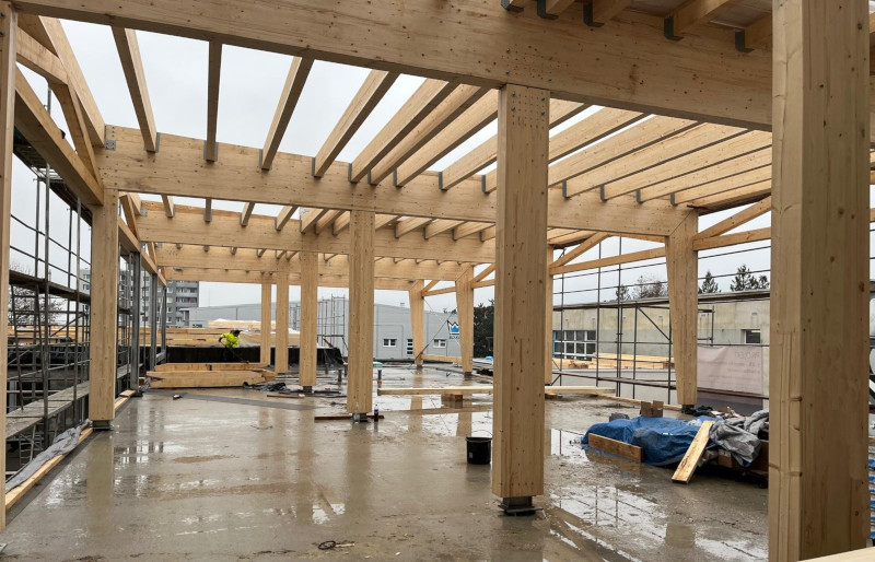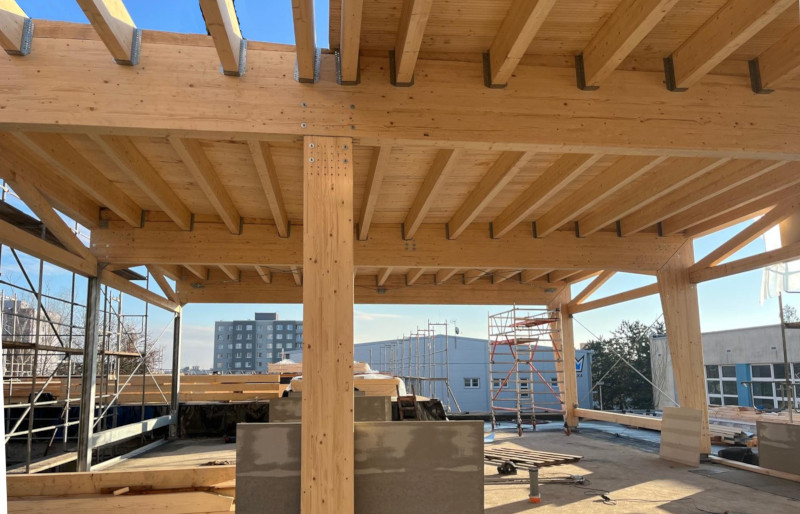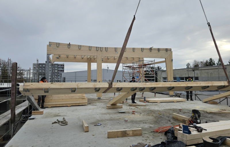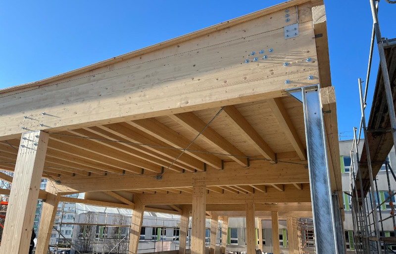 z lepeného lamelového dřeva jakosti GL 24h. Stojky jsou kotveny ke stávající prefa konstrukci stropu přes ocelové svařované patky. Rámový spoj stojky a příčle je řešen přes styčníkový plech s kolíky a svorníky. Střešní rovina je v mírném spádu a tvoří jí vaznice v osových vzdálenostech 833 mm, na kterých je položen střešní záklop z desek OSB3 P+D tl. 25 mm. Ztužení ve střešních a stěnových rovinách zajišťují ocelová táhla s napínacími maticemi.