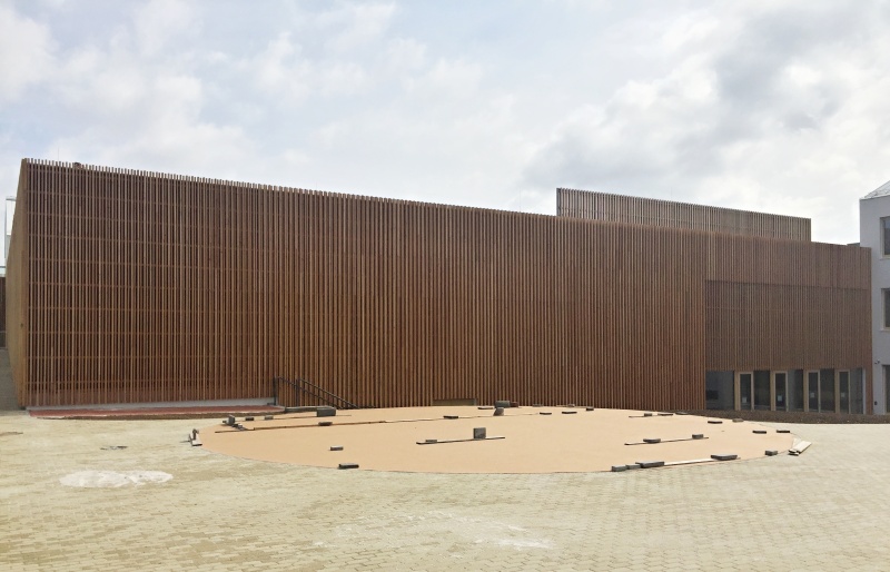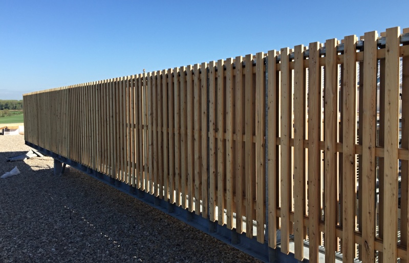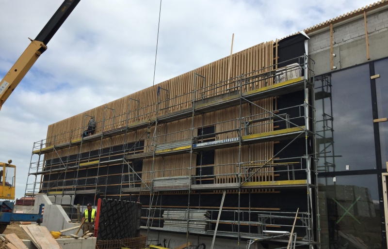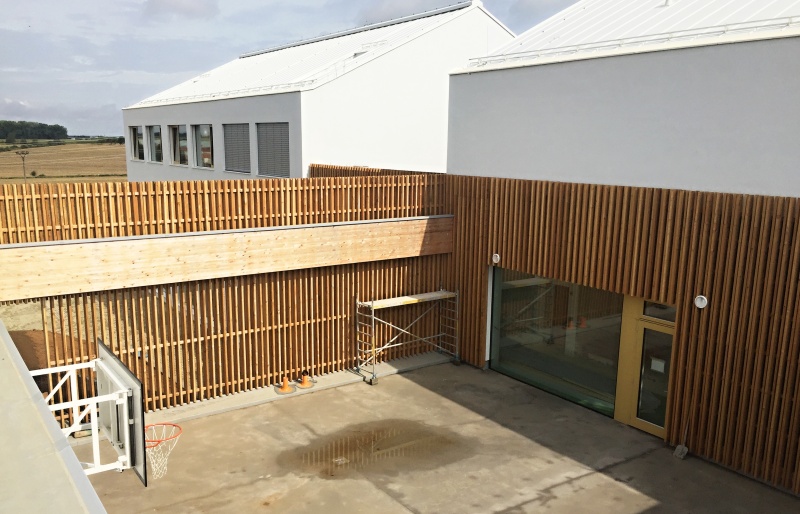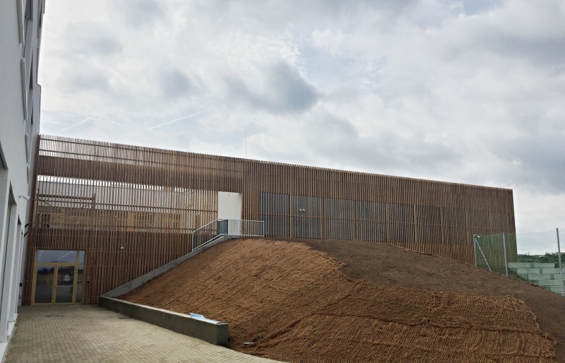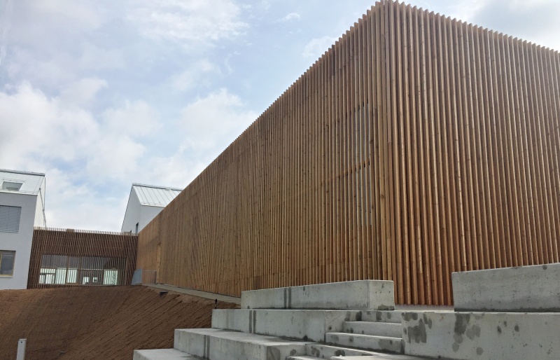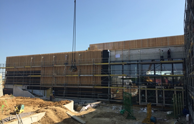 Na nové ZŠ pro obce Psáry a Dolní Jirčany jsme na několika částech fasády realizovali dřevěný obklad. Ten je tvořen ze svislých latí z materiálu sibiřský modřín, který je kladen s prostorovým uspořádáním. Jedna lať má tloušťku 60 mm a vedlejší je kladena s tloušťkou dvojnásobnou, což je 120 mm. Toto kladení tvoří na první pohled měnící se prostortové uspořádání. Nezbytnou podmínkou naší dodávky jsou i kotevní ocelové prvky, systém pomocých podkladních latí a nezbytné černé UV pojistné folie. Zateplení nebylo předmetem naší dodávky.
