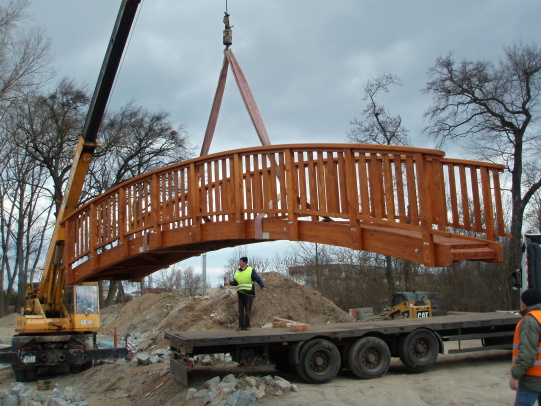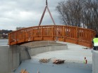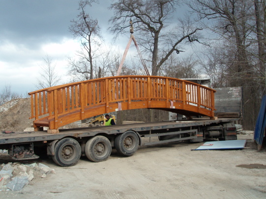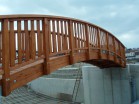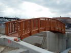 V rámci výstavby vodní elektrárny na říčním toku Labe naše společnost realizuje dodávku dřevěné obloukové lávky o rozměrech cca 9 x 1,5 m. Hlavním nosným prvkem lávky je dvojice lepených obloukových nosníků profilu 140/300 mm s poloměrem zakřivení R = 15 m. Nosný systém je dále doplněn podélníky, příčníky, zavětrováním, vlastní mostovou a zábradlím.