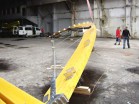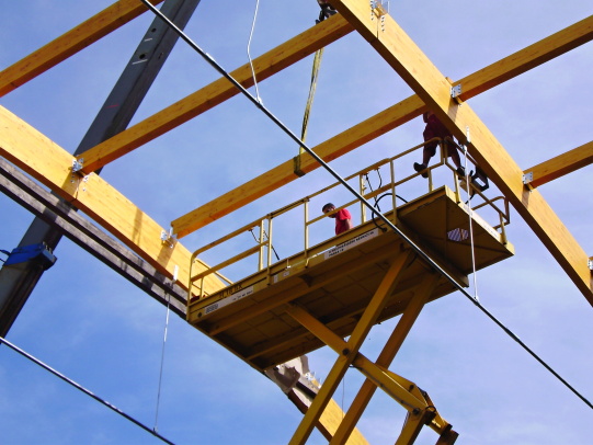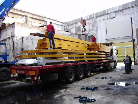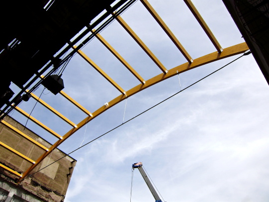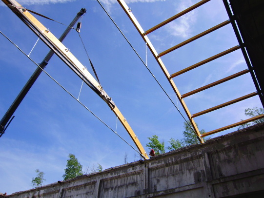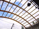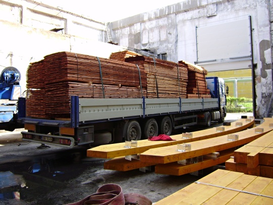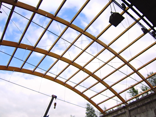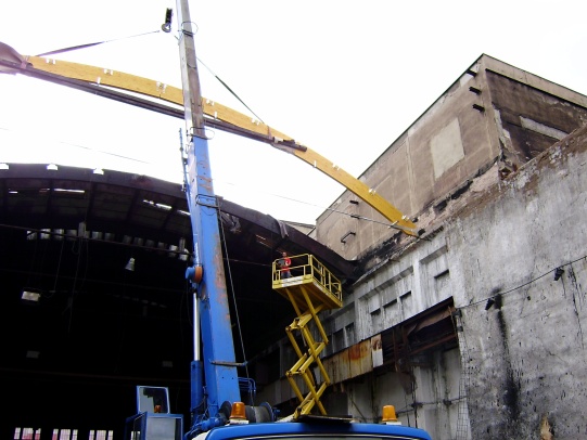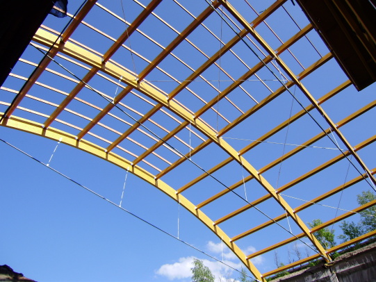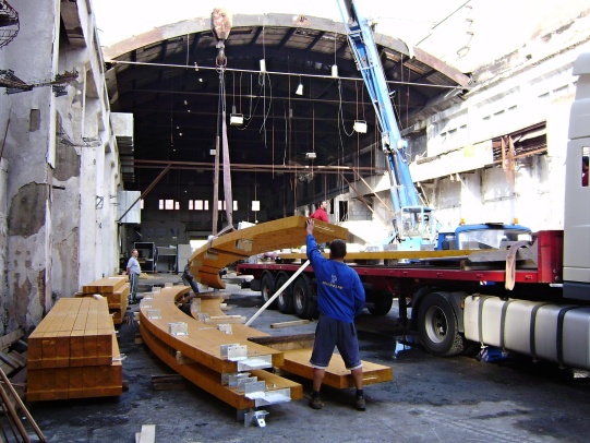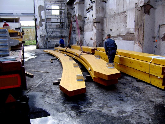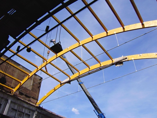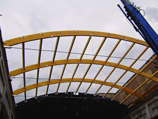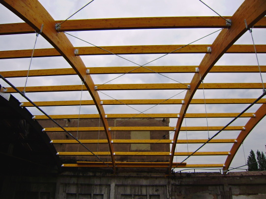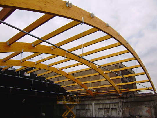 Stávající objekt haly má střešní konstrukci provedenou z lepených dřevěných obloukových vazníků s ocelovým táhlem. Ve vyhořelé části jsou tudíž naší společností realizované právě nové lepené dřevěné obloukové vazníky s ocelovým táhlem doplněné systémem lepených přímých ztužidel, řezaných vaznic a dřevěného prkenného záklopu. Půdorysné rozměry nově realizovaných dřevěných konstrukcí jsou 21,7 x 35 m. Lepené dřevěné obloukové vazníky na rozpon 21,7 m a v počtu šesti kusů jsou usazeny a kotveny do stávajících betonových kapes. Lepená dřevěná ztužidla a vaznice kotvená pomocí ocelových botek k obloukovým vazníkům doplněná ve dvou polích ocelovými zavětrovacími kříži ztužují celou nosnou konstrukci haly. Na ztužidlech a vaznicích jsou horem kotveny řezané krovy s dřevěným prkenným záklopem.