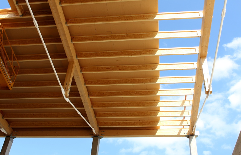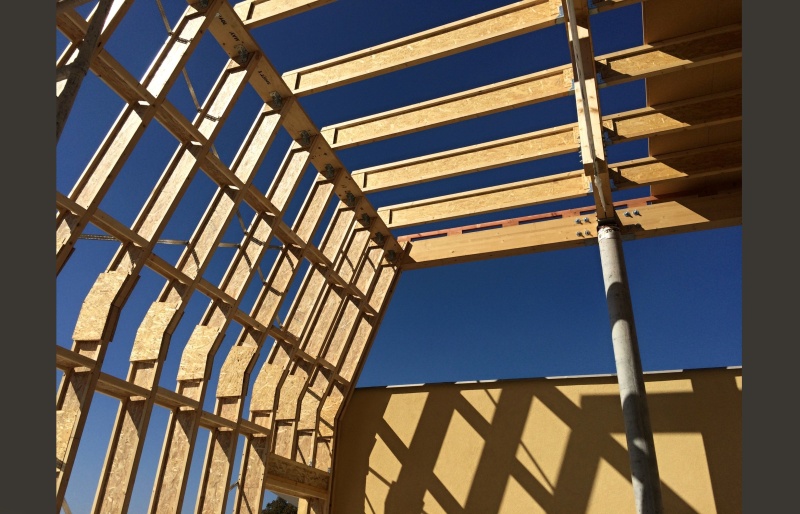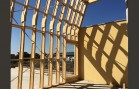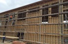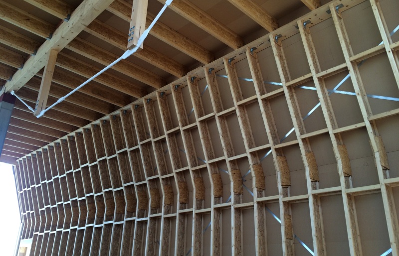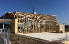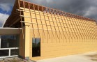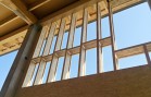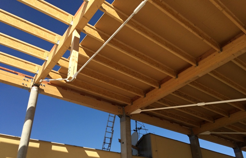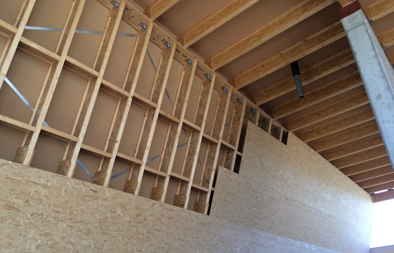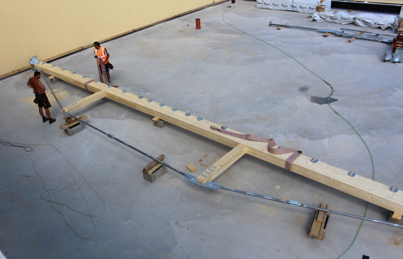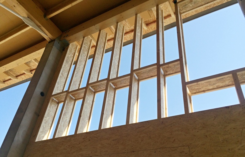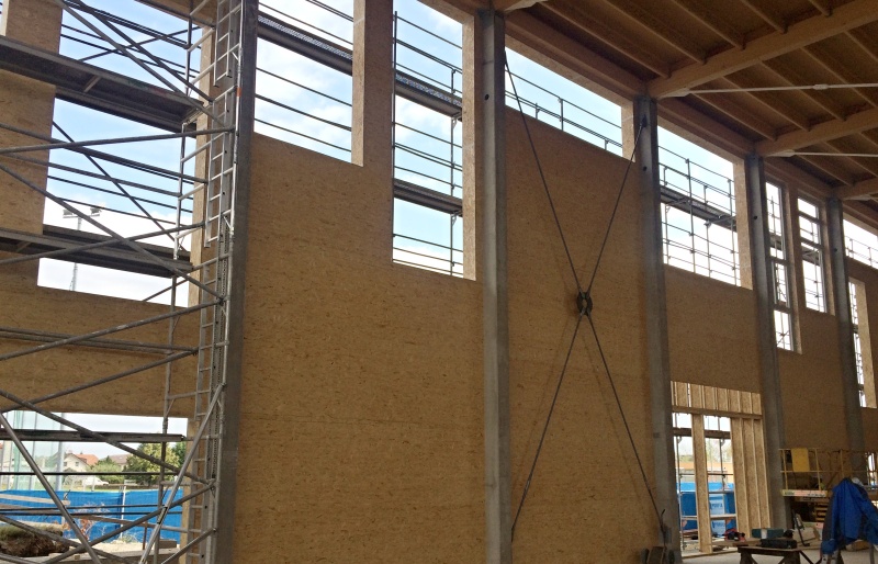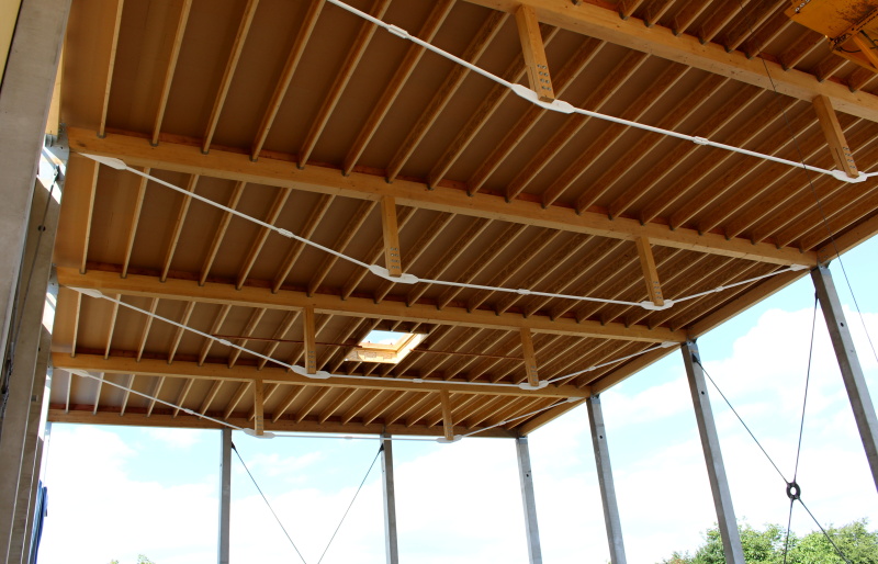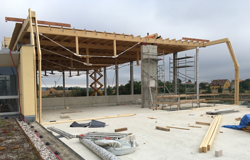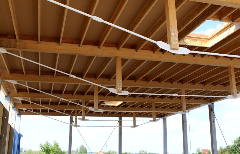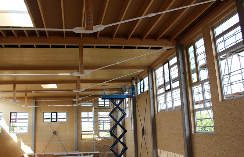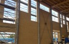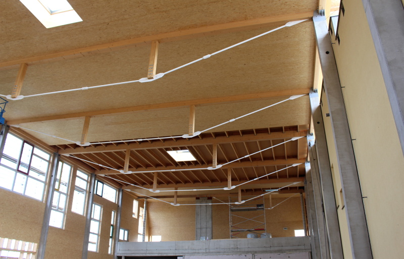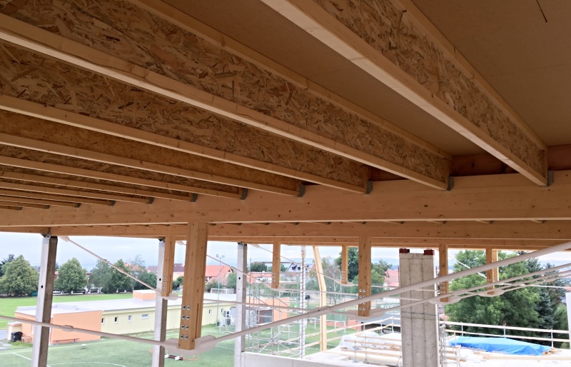 Energeticky pasivní tělocvična o půdorysných rozměrech cca 18,5 x 38,6 m realizovaná jako přístavba stávající ZŠ a MŠ má nosnou konstrukci stěn vytvořenou ze železebetonových sloupů, na kterých jsou uloženy střešní vzpínadlové vazníky z dřevěných lepených nosníků a ocelových táhel. Pouze krátký komentář k ocelovým vzpínadlovým táhlům. Ta jsou z důvodu požární odolnosti ošetřena protipožárním nátěrem.