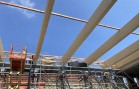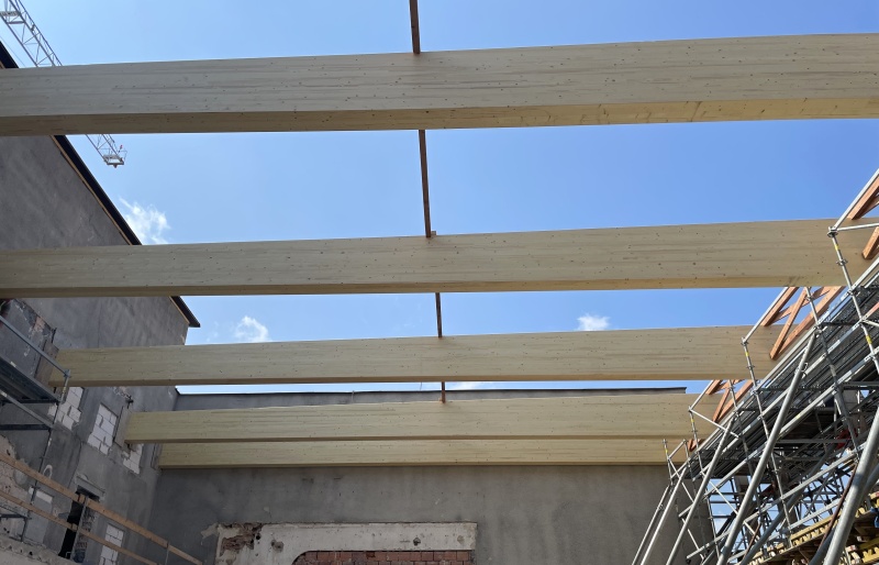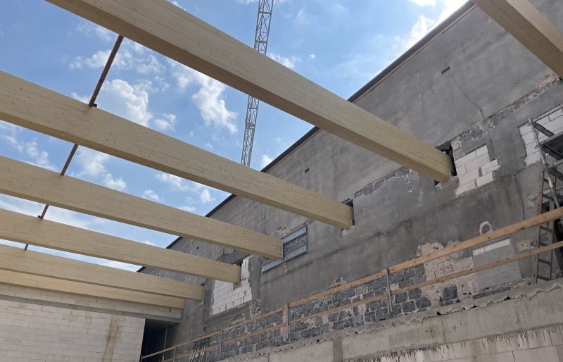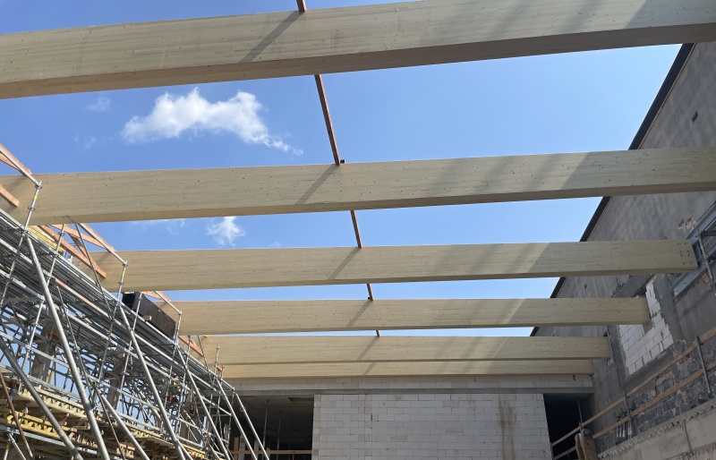 Součástí dostavby a rekonstrukce původních objektů v Chrudimi byla i stavba sportovní haly, kde jsme realizali nosné střešní konstrukce. Jedná se o halu s půdorysnýni rozměry 21,5 x 16 m. Nosným systémem jsou lepené dřevěné vazníky s proměnou výškou, které tvoří budoucí sedlový tvar střechy. Vazníky v osových vzdálenostech cca 3 m a v poštu 8 ks, jsou z lepeného smrku jakosti GL 24h a jsou ponechány díky bezbarvému lazurovacímu nátěru v přírodním vzhledu.