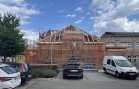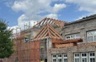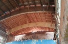 Veškeré dřevěné střešní konstrukce jak přední část, tak i zadní část s prostředním objektem, vykazovaly značné poškození dřevokaznými houbami a hmyzem. Bylo rozhodnuto o jejich demontáži a o náhradě střešních konstrukcí novými dřevěnými prvky. A to bylo právě předmětem naší realizace. V prostřední části původní tělocvičny z obloukových sbíjených nosníků bylo rozhodnuto o náhradě pouze jednoho kusu obloukového nosníku. Ten byl nahrazen lepeným BSH obloukovým nosníkem se stojkami pro vytvoření sedlového tvaru střechy. Stojky byly délkově zařezaný na stavbě, aby bylo zabezpečeno napojení původního tvaru střechy, na nově realizovanou část, což se tímto postupem zabezpečilo.