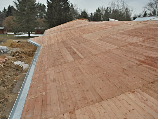 Střešní plášť má poměrně složitou konstrukci. Navržen je jako dvouplášťová střecha s odvětráním, při čemž nasávání je u okapu a výfuk je v hřebenovém dýmníku.