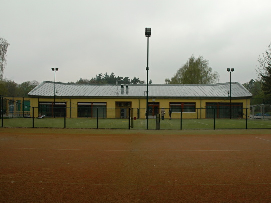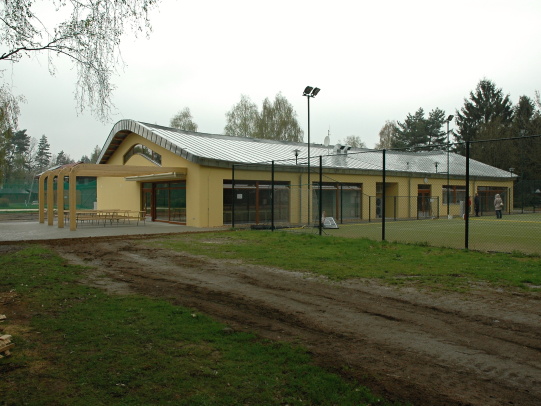 Na opačné straně objektu je větší přístřešek o půdorysných rozměrech cca 8 x 16,4 m. Konstrukce tohoto přístřešku je opět z lepeného lamelového dřeva a to ve tvaru obdobném jako je na hlavním objektu, či-li sedlová konstrukce s táhlem se zaobleným vrcholem a podélně se zvedající se částí na volném konci přístřešku. Toto je vytvořeno z obloukových vlašských krokví v posledním poli.