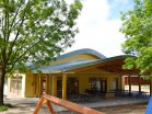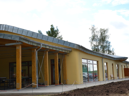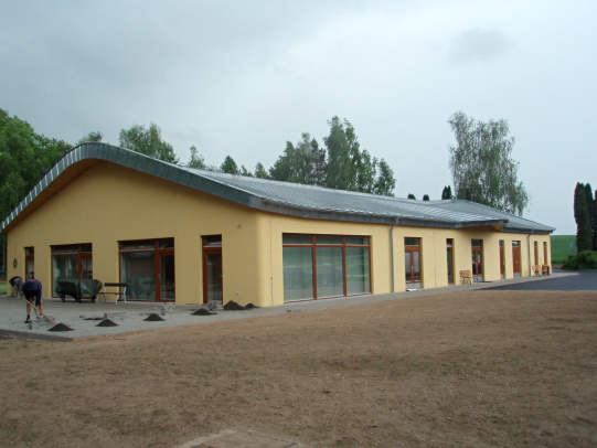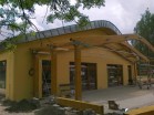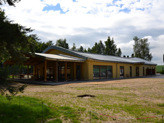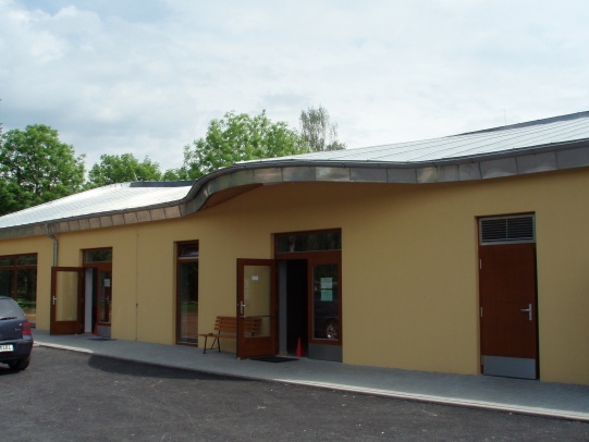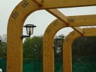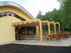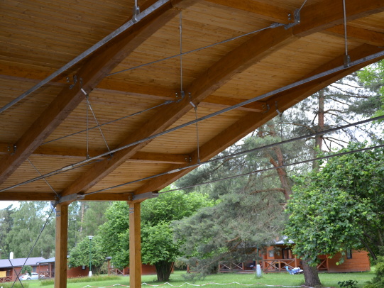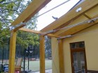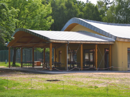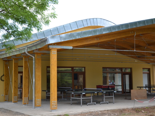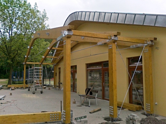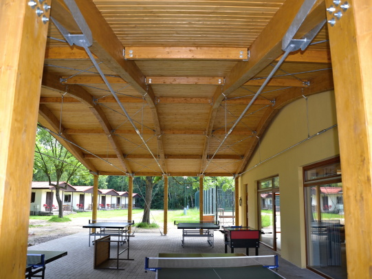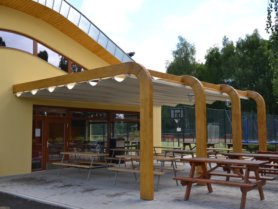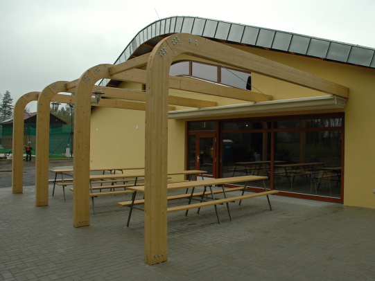 Objekt školícího střediska je u obou štítů doplněn přístřeškami ( pergolami ), které jsou vytvořeny z lepeného lamelového dřeva v obloukovém provedení.