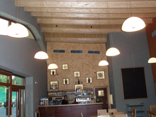 Pivovar Svijany nedaleko obce Drhleny u Mladé Boleslavi realizoval svoje školící a rekreační středisko, jehož střešní konstrukce jsou z řezaného dřeva a současně lepeného lamelového dřeva v obloukovém provedení. Zastřešení hlavního objektu o půdorysných rozměrech cca 31 x 18 m má výšku hřebene od 6 do 7 m. Střecha je sedlová se zaobleným hřebenem. Ten je je v podélném směru ve střední části rovný a na koncích ( ve štítech ) se zvedá a tvoří plynulou křivku. Zaoblení hřebene je vytvořeno z lepených obloukových krokví, které jsou pohledové z interiéru. Ostatní krokve v rovné části střechy jsou z rostlého dřeva v nepohledové kvalitě a budou schovány pod finálním podhledem. Krokve jsou pokládány na betonové věnce, které mají stejný tvar jako střecha, tj. sedlové se zaobleným vrcholem. V horní vrstvě střešního pláště je nad bočním vstupem vytvořena " vlna ", která přechází přes hranu objektu a tvoří tak markýzu nad vstupem.