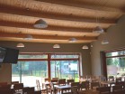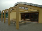 Menší přístřešek před vstupem do restaurace se skládá ze čtyř rámů se zaobleným rohem. Rámy jsou dlouhé 6,3 m a vysoké cca 3 m a jsou ukládány v osových vzdálenostech 2,5 m. Na jedné straně jsou kotveny do věnce objektu a na druhé straně do základového pasu. Na pergolu je nainstalováno zařízení pro zastínění venkovního sezení - baldachýn.