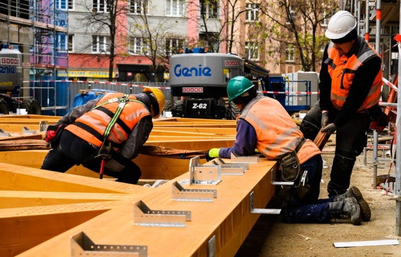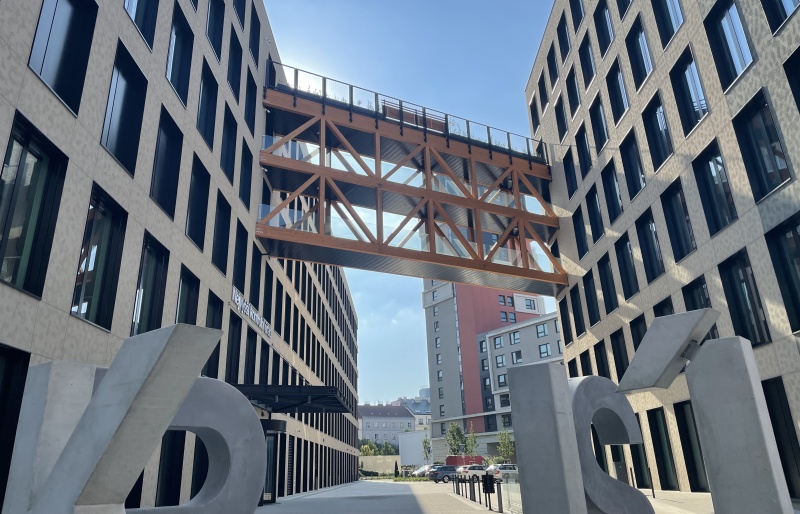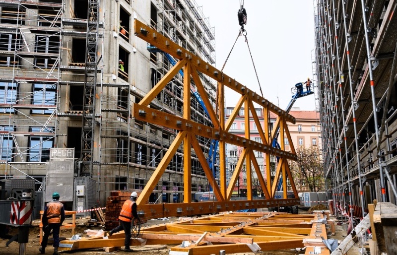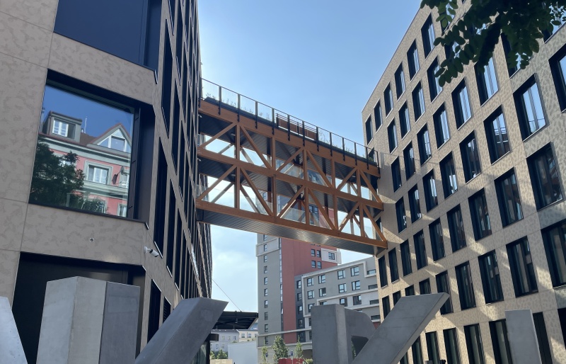 příhradová dřevěná konstrukce z lepeného lamelového dřeva doplněná o konstrukci podlah a zastřešení. Lávka je dvoupodlažní a bude sloužit pro pěší provoz mezi oběma objekty v úrovni 4. a 5. nadzemního podlaží.