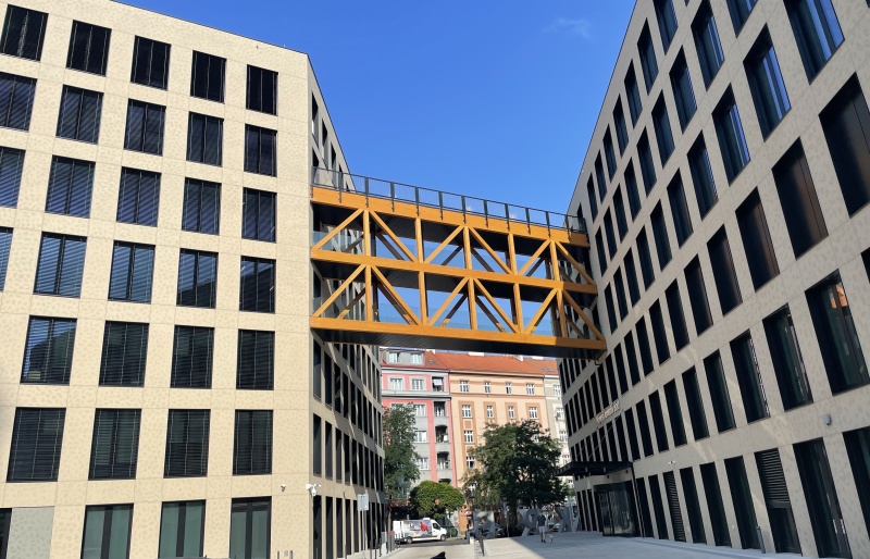 spojovací krček mezi dvěma kancelářskými objekty. Jedná se o spojovací lávku - koridor, jehož nosnou konstrukcí je