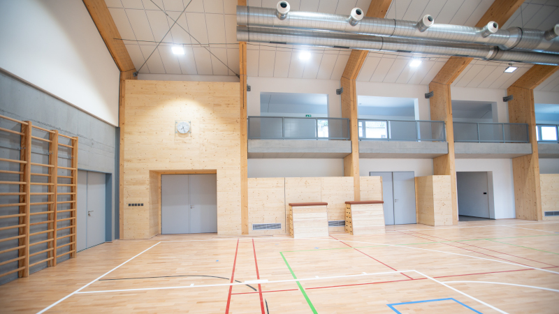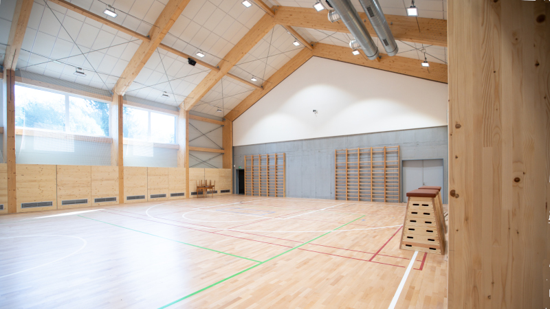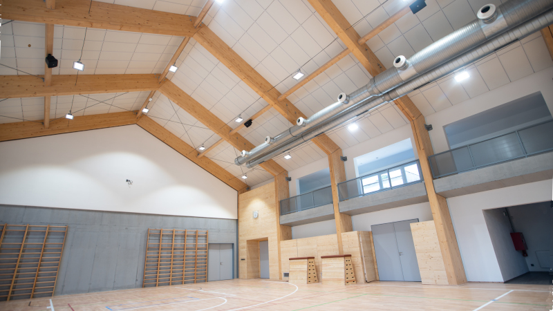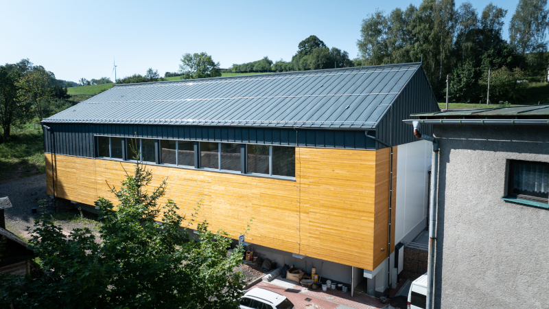 Naše společnost realizovala na této stavbě sportovní haly v Bernarticích dřevěnou nosnou konstrukci z lepeného lamelového dřeva doplněnou o KVH hranoly nebo řezané hranoly z masivu. Dřevní hmotou je smrk. Dále jsme zde realizovali část střešního pláště a fasádní provětrávaný obklad, který je kotven přes sendvičové polyuretanové panely k nosné dřevěné konstrukci stěn a štítů.