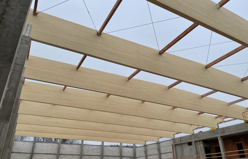 Vazníky jsou ukládány ve vzdálenostech 5 m a na oba koncích směrem do exteriéru jsou vykonzolovány pro vytvořenín přesahu střechy v délce cca 1,7 m. Střešní konstrukce je dále doplněna dřevěnými řezanými ztužidly s ocelovými zavětrovacími kříži a rovněž tak z důvodu klopení i dřevěnými vzpěrkami. Z hlediska architektonického jsou lepené dřevěné vazníky ošetřeny lasurovacím lakem bez pigmentu, čímž je zachován přírozený vzhled dřevní hmoty.