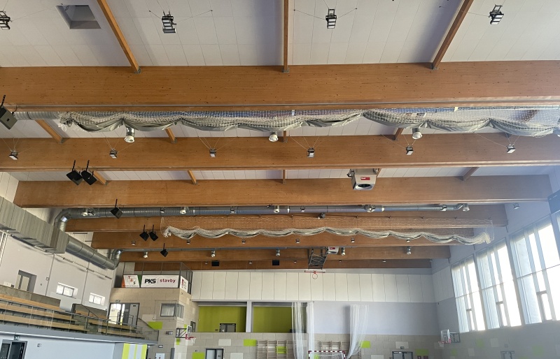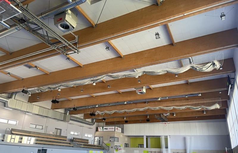 Realizovaná sportovní hala o půdorysných rozměrech cca 31 x 47 m má střešní nosnou konstrukci z lepených dřevěných plnostěných nosníků v přímém provedení. Nosníky, které vytváření současně přesah střechy přes podélné stěny, byly vyrobeny a dodány v délce přes 33 m a jsou kladeny vždy ve dvojici s mezerou.
