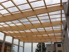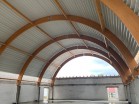 Lepená oblouková střešní konstrukce s malým sklonem doplněná o lepená ztužidla a řezané krovy ...