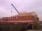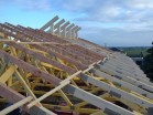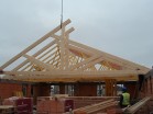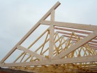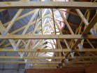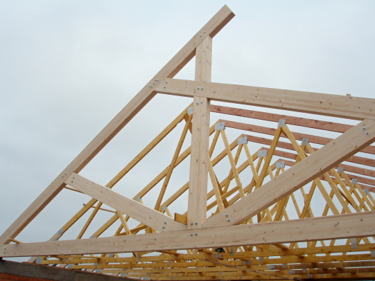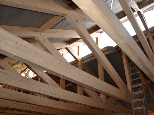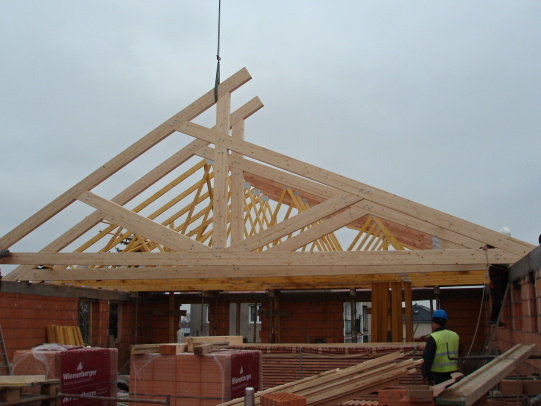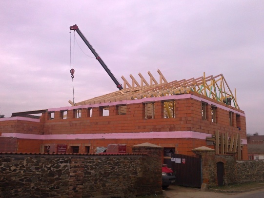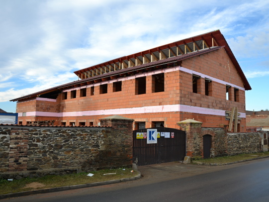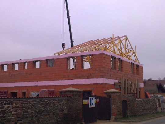 Naše společnost realizovala na této stavbě kompletní dodávku zastřešení objektu včetně střešní krytiny a klempířských prvků. Část nosné střešní konstrukce tvoří sedlové sbíjené vazníky, které jsou zakryty podhledem. Zbylá část a to v prostoru nad schodištěm jsou vazníky pohledové a to konstrukcí z lepeného lamelového dřeva. V místě rozšíření objektu jsou sbíjené vazníky doplněny řezanými krokvemi osazenými mezi ocelové průvlaky. Na takto vytvořené nosné konstrukci je položena střešní paropropustná folie, dřevěné kontralatě, latě a vlastní střešní betonová taška.