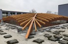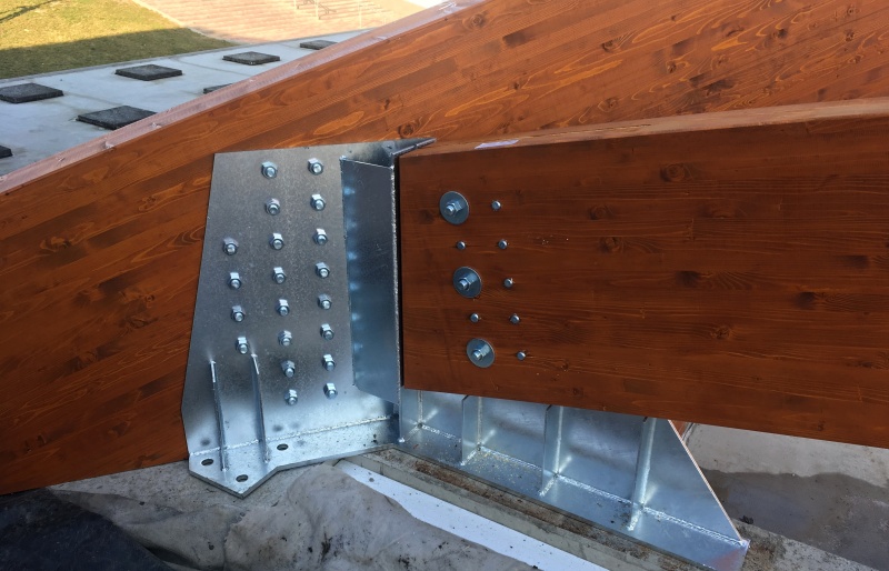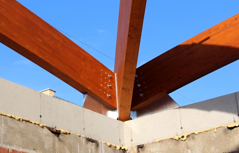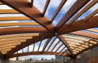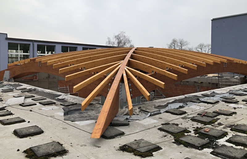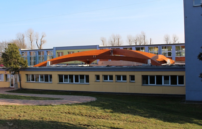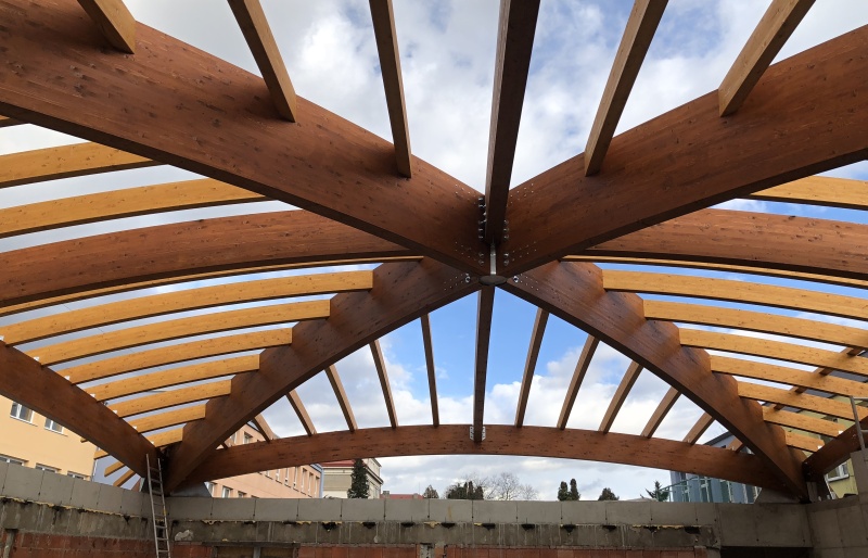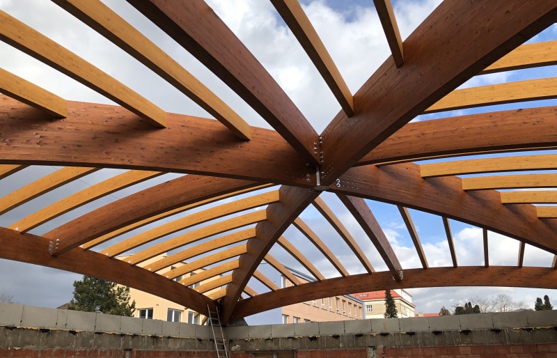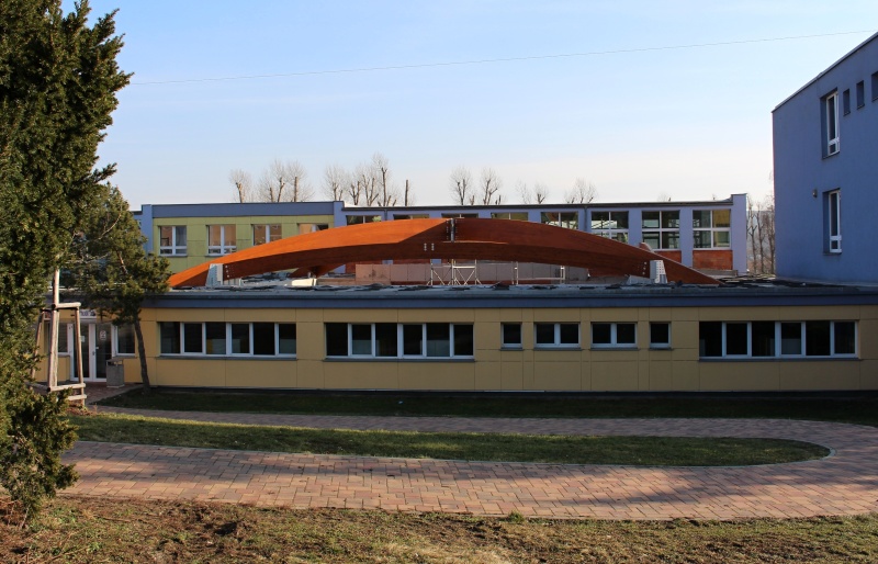 Nově realizovaná vestavba školní auly do atria při ZŠ Loučanská v Praze - Radotíně má tvar ploché kopule nepřevyšující okolní zástavbu. Naší realizací jsou střešní konstrukce právě této auly. Jedná se o zastřešení prostoru půdorysných rozměrů 14,6 x 17,6 m z lepených dřevěných obloukových vazníků. Prostor je překlenut dvěma hlavními nosníky do tvaru kříže a je doplněn vloženými dřevěnými lepenými obloukovými nosníky, které jsou po obvodě vynášeny opět obloukovými nosníky. Architektonickou zajímavostí této konstrukce jsou barevné nátěry lepeného dřeva, které je provedeny ve dvou odstínech a to tak, aby došlo opticky ke zvýraznění jedné části dřevěné konstrukce vůči druhé.