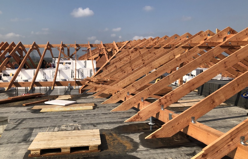 Střešní konstrukce objektu " Domov seniorů v Šeberově " jsou řešeny jako soustava sedlových střech. Vlivem lichoběžníkového půdorysu většiny objektů neprobíhá hřeben střechy vodorovně, ale je v mírném sklonu.