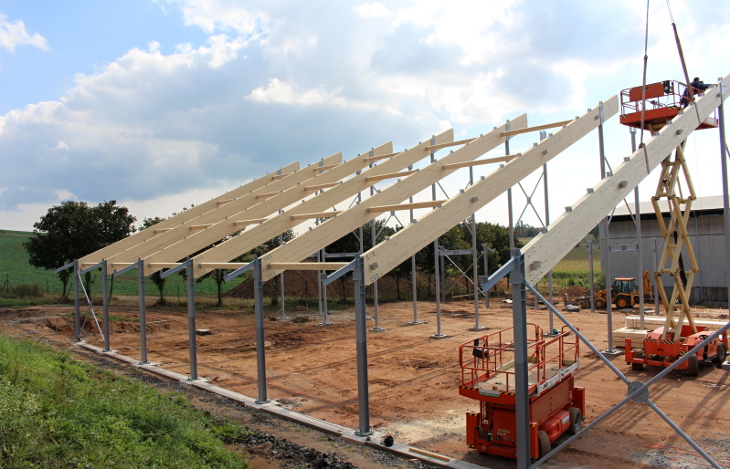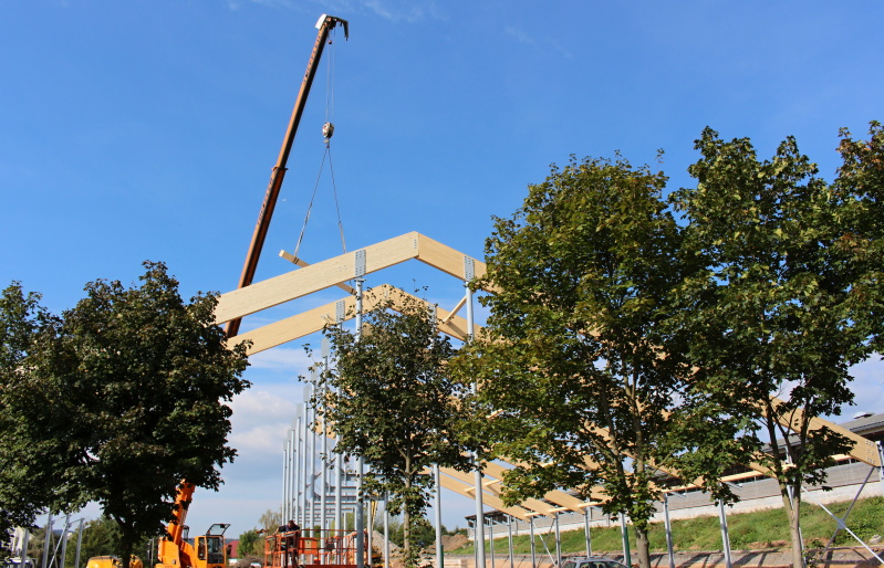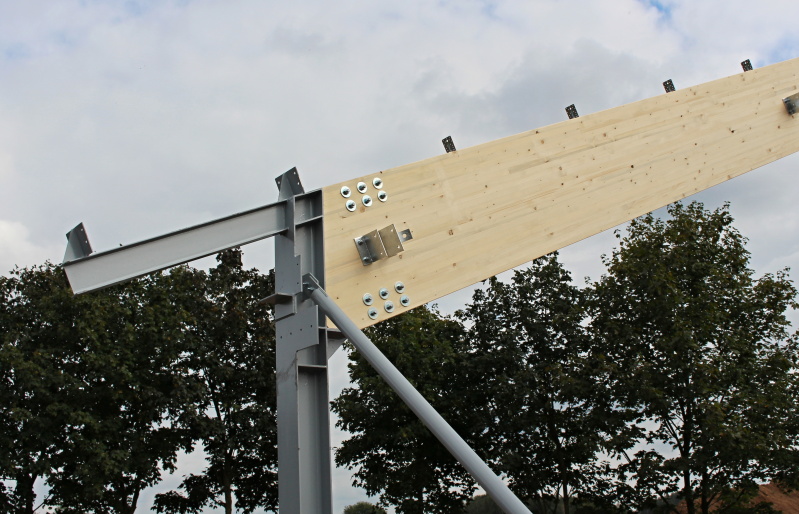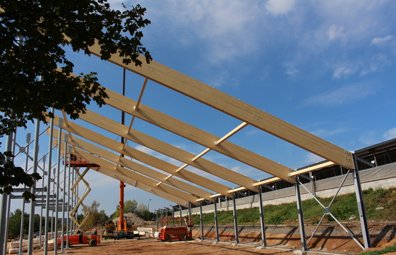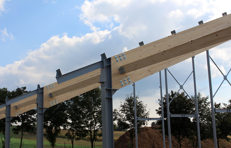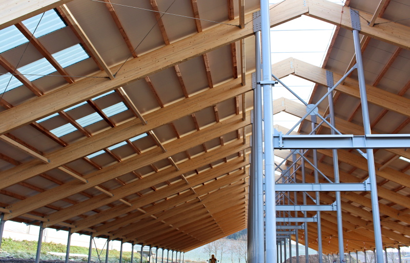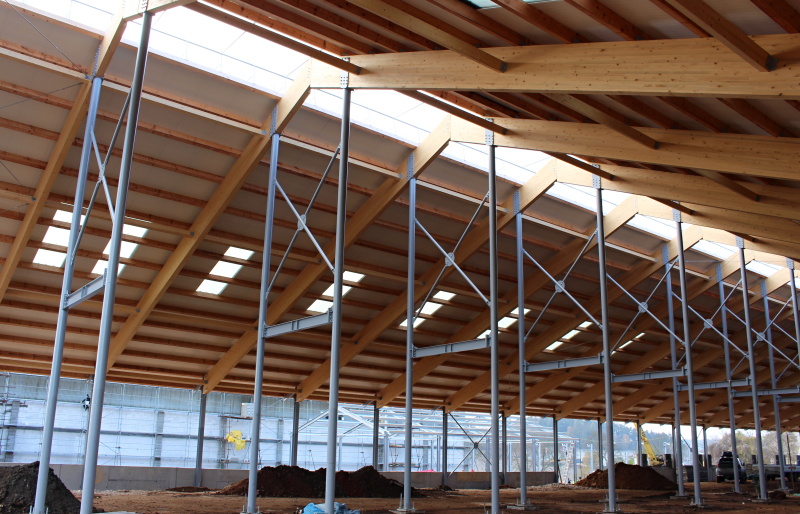 ocelových sloupů a střešních dřevěných lepených vazníků v přímém provedení. Z hlediska tuhosti střešní konstrukce je nosný systém lepených vazníků doplněn o lepená ztružidla, která jsou navíc v několika polích opatřena křížnými ocelovými zavětrovacími táhly.