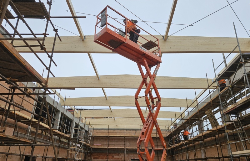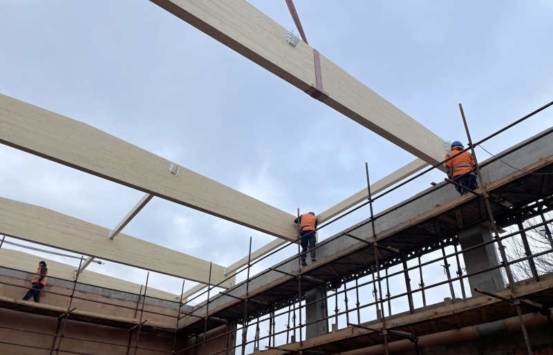Zázemí, které tvoří přístavky u štítových stěn o půdorysných rozměrech podstatně menčích, mají nosné střešní konstrukce také z lepeného lamelového dřeva.