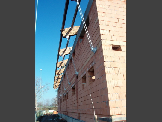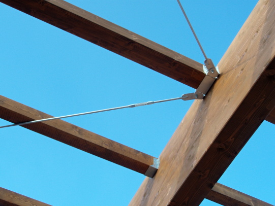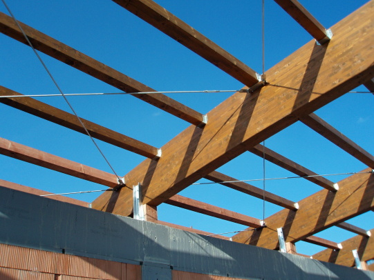 Mezi vazníky jsou vloženy dřevěné vaznice, které nesou souvrství střešního pláště. Tuhost konstrukce v rovině střešního pláště zajišťují táhla z kruhové oceli.
