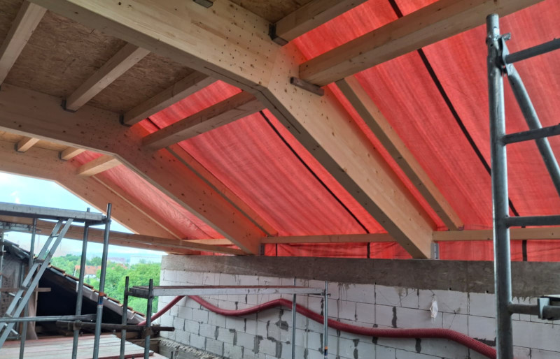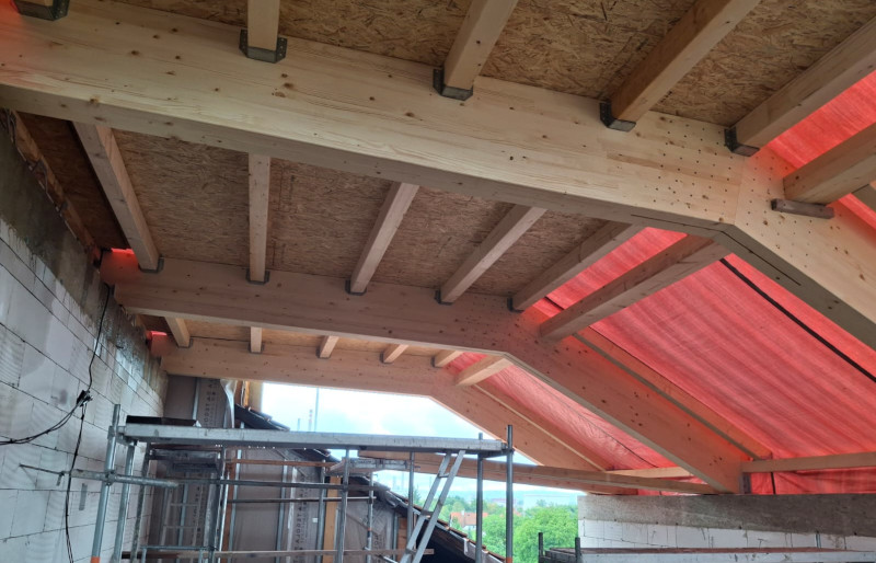 Střešní lomená vazníková konstrukce složená ze třech lepených přímých BSH nosníků s montážním spojem pomocí ocelového plechu a kolíků a doplněná o dřevěné KVH krokve byla předmětem naší dodávky na této stavbě.