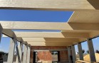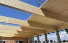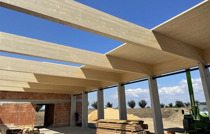 V Praze Čakovicích jsme zrealizovali střešní konstrukce volnočasového centra. Na betonové sloupy byly usazeny přímé BSH nosníky z lepeného lamelového dřeva a po té jako záklop byly použity dřevěné CLT panely (příčně lepené dřevo).
