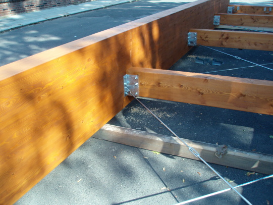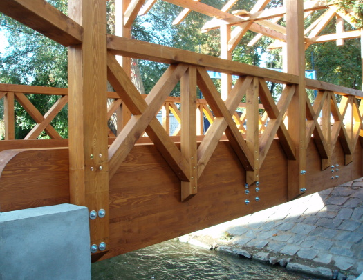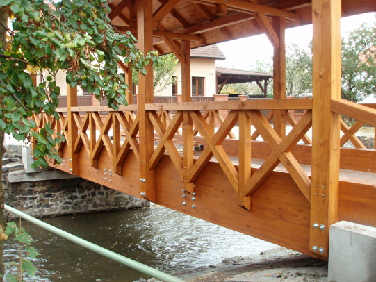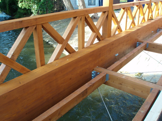 K vyšší prostorové stabilitě dřevěné nosné konstrukce přispívá podmostové zavětrování tvořené kříži z ocelových tyčí průměru.