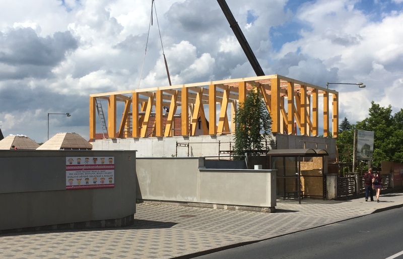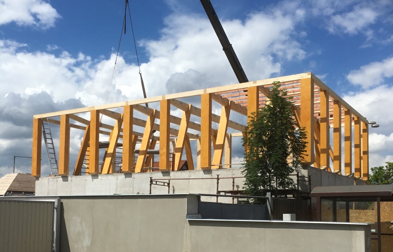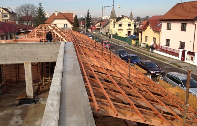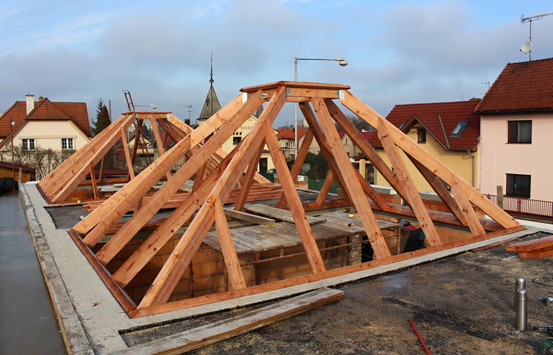 Střešní konstrukce v Čelákovicích realizované pro investora stavby, kterým je Sbor Církve bratrské, jsou z řezaného dřeva, ale rovněž tak i z lepeného lamelového dřeva v přímém provedení. Stavba byla naší společností zahájena právě konstrukcí z řezaného dřeva a pokračovala vlastní realizací - montáží lepených konstrukcí. Ta bude sloužit jako nosný systém střechy budoucí kaple.